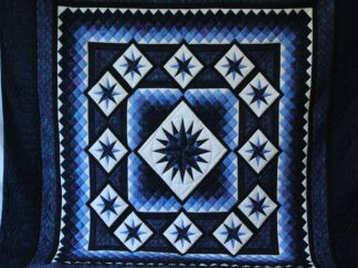 $390.00Elegant flowers combined with friendship stars are a lovely combination on this show stopping original design quilt. The colors in the paisley border bring it all together with red, white and blue giving it a hint of an Americana feel. Karel”s signature triple border surrounds the central flower design with a red stripe in the center just for fun. There’s plenty of precise hand-quilting in the small cross-hatched diamonds that frame the center block. A hanging sleeve along with Karel”s signature patch are included on the back. -