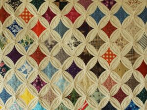 Many little patches make this a special quilt, no two quilts are the same. Each patch has quilting on it so it makes for many, many stitches, about 7-8 stitches per inch.The back is a solid cream one piece cotton fabric.