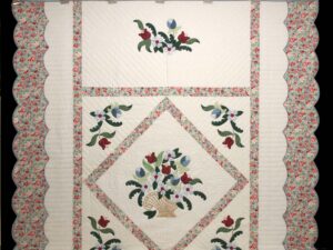 $1,895Another gorgeous original quilt pattern by C Jean Horst using fabrics with a wonderful variety of subdued cotton prints. Note the excellent appliqué work and the fine quilting. Signed in embroidery and dated by its designer. This design was formerly called Victorian Basket. Made by an Amish woman here in Lancaster. Copyright pattern -- directions unavailable. -