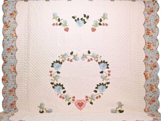 Very lovely with beautiful fabrics and a great design. Look at the abundant quilting in the center heart, and the precise appliqué work. This is an original pattern designed (and signed in embroidery) by Lancaster's renowned quilt designer C Jean Horst. Jean is noted for her fine fabric selections. Well quilted by an Amish woman in her own home. Pattern is available in a book authored by C Jean Horst called The Heart of Roses Quilt (ISBN: 1561481068).