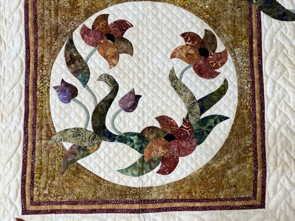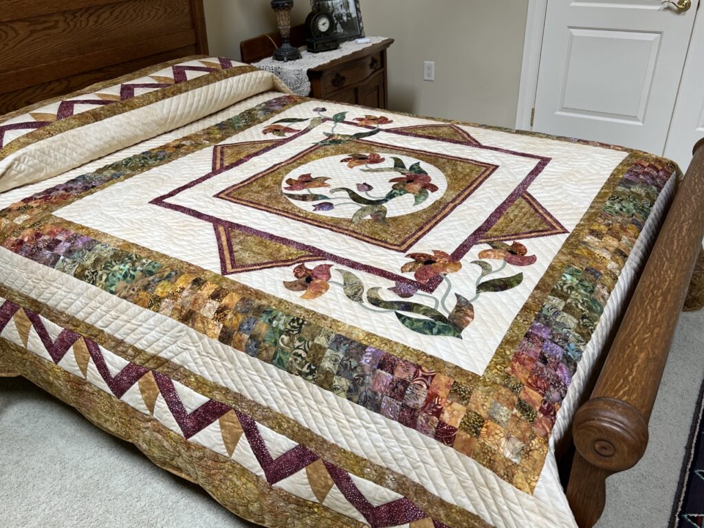 A queen size quilt that has an excellent combination of skills. It is an original design by C Jean Horst, using needle turn hand appliqué, machine piecing, decorative hand quilting and great 100% quilters cotton fabrics in colors of golds,  plums, greens and neutrals  in a tasteful combination. An amazing design by Lancaster’s renowned designer. Note the abundance of quilting surrounding the focal center applique work. The background fabric are all in shades of neutrals as well as the backing print is in eggshell. Quilted by an Amish friend. Signed and dated by its designer. Copyright pattern — no directions are available. A fine eggshell 100% cotton fabric covers the back of the quilt. The quilting density is very good, averaging about 130 linear inches of stitching per square foot. The stitching is very good with about 9 stitches per inch. The quilt has a small documentation tag sewn into the back side of the quilt documenting the maker, fabric content, date, name of pattern, and a note about being made in America, quilted by an Amish friend. Excellent choice! A high quality quilt.