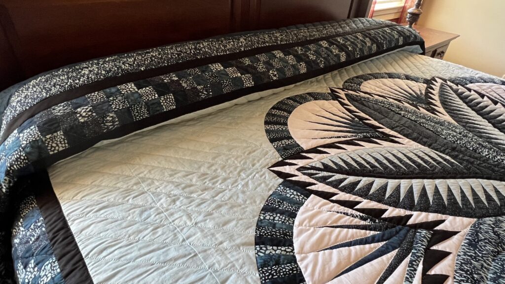 A gorgeous Judy Niemeyer Quiltworx pattern made with her foundation papers.  Yes — sewn on paper and then the papers are torn out  gently and Presto — you have perfect curves and points.  A  time consuming method but a fantastic outcome.  This quilt is made with 100% quilters cotton fabrics in navy marble batik, blue prints and blues with white with black.  A 100% cotton gray speckled fabric is used for the  backing of the quilt.    This quilt has 9 hand quilted stitches per inch.  A very showy and unique quilt.