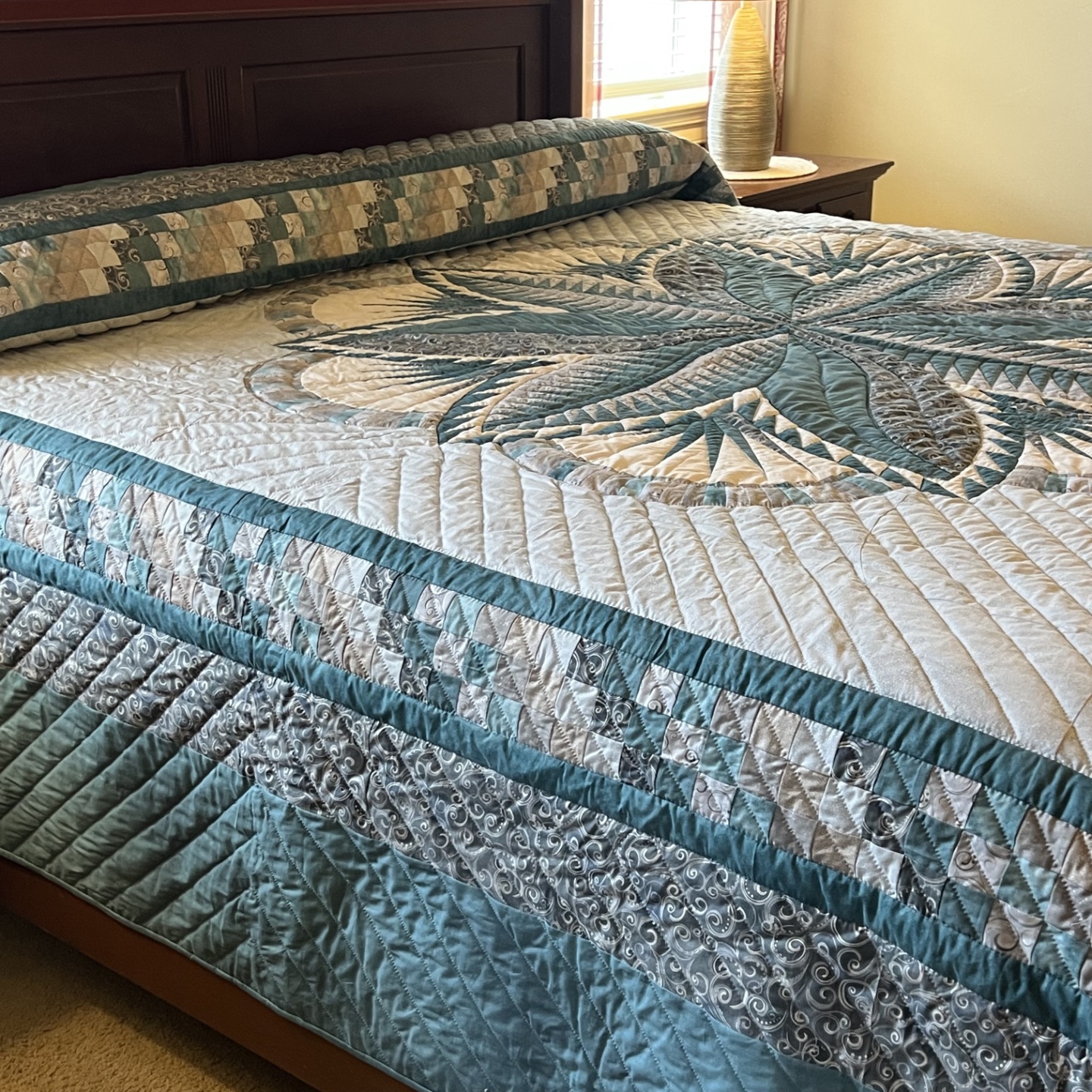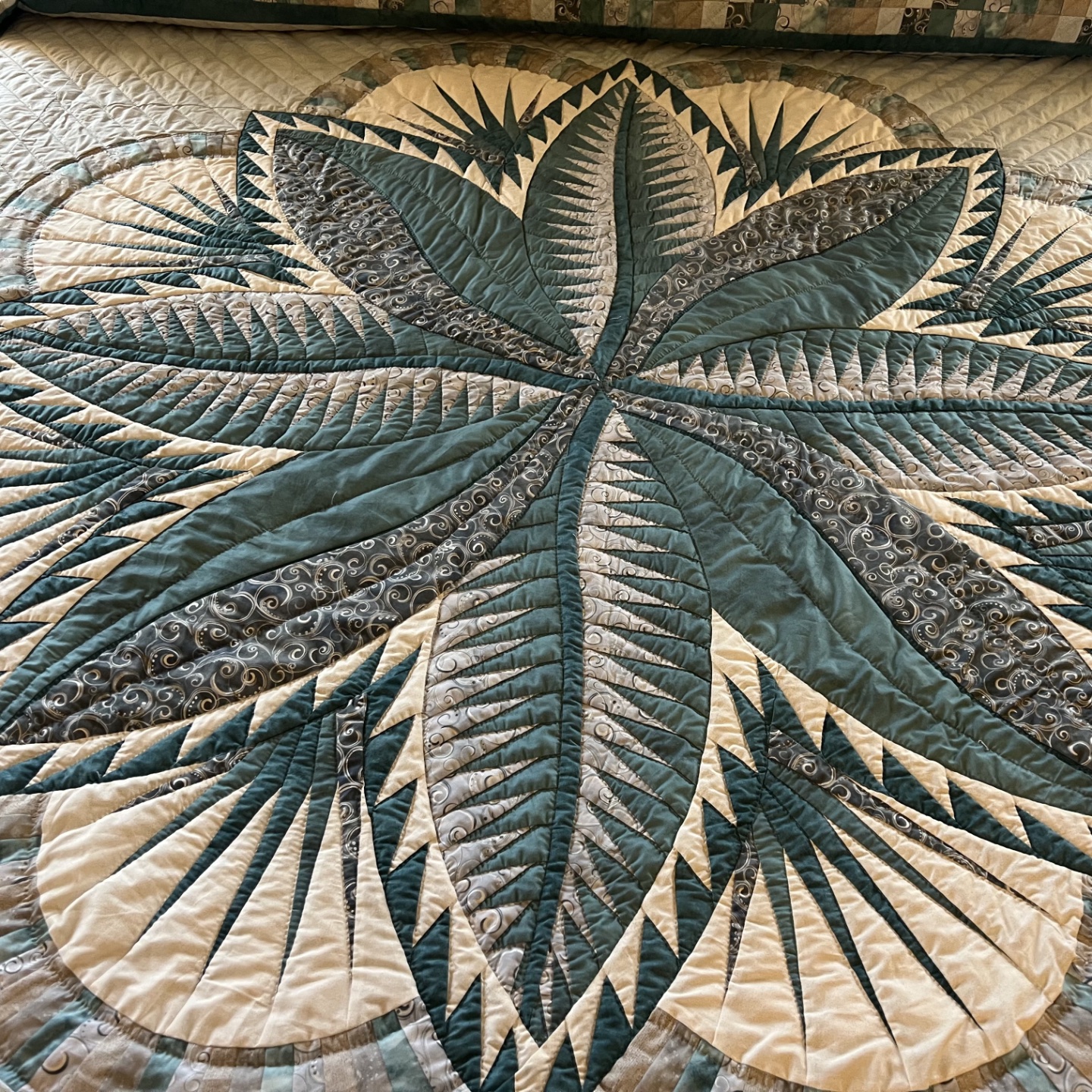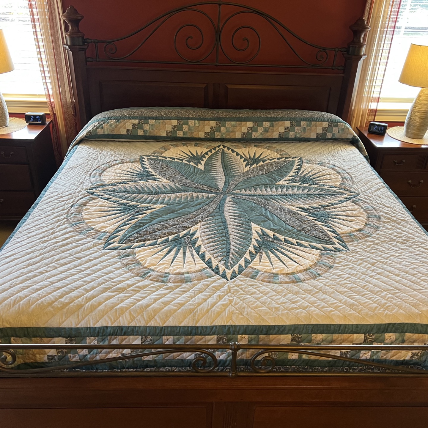 A gorgeous Judy Niemeyer Quiltworx pattern made with her foundation papers. Yes — sewn on paper and then the papers are torn out  gently and Presto — you have perfect curves and points.  A  time consuming method but a fantastic outcome. This quilt is made with 100% quilters cotton fabrics in teals and dusty gray and ivory prints. A 100% cotton fabric is used for the  backing of the quilt in light colors. This quilt has 8 hand quilted stitches per inch.  A very showy and unique quilt.