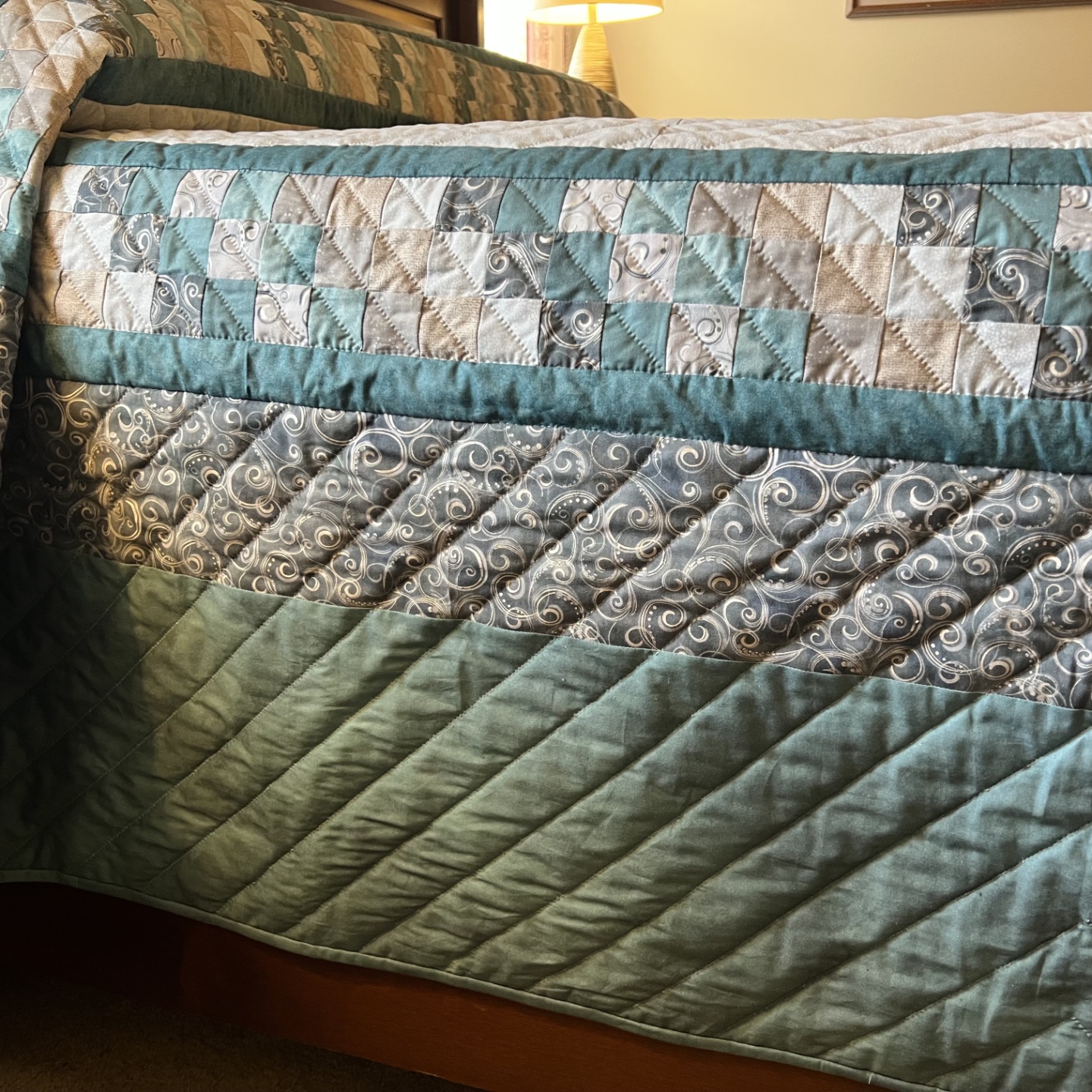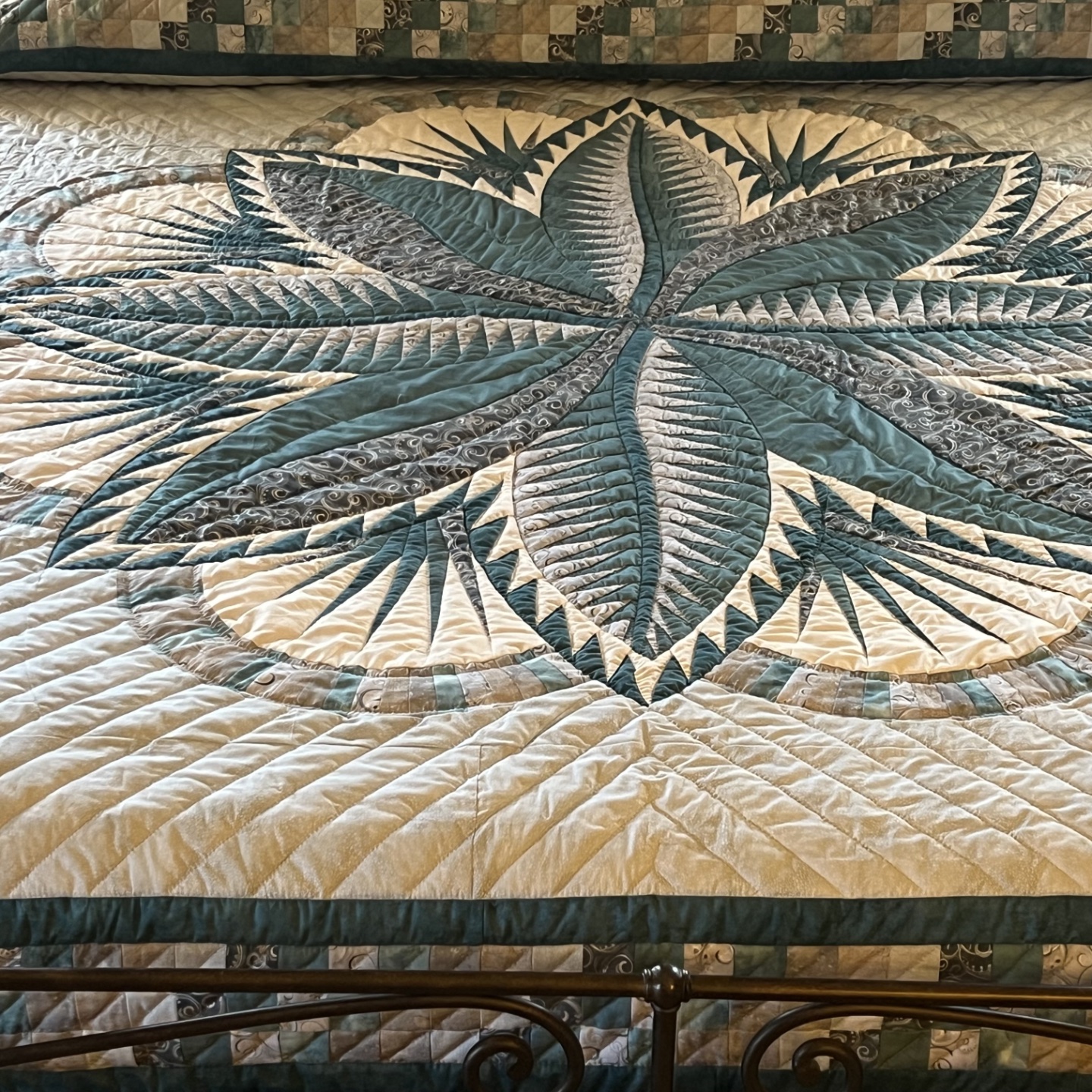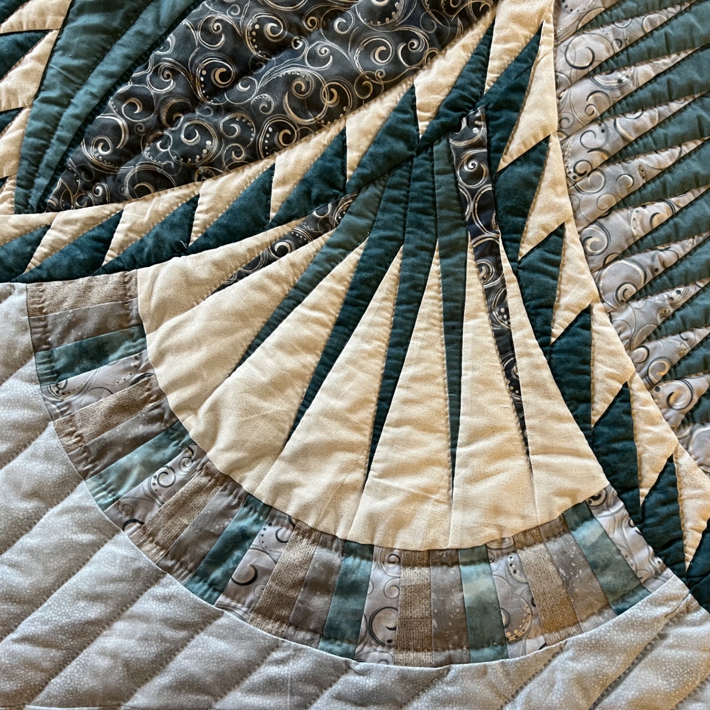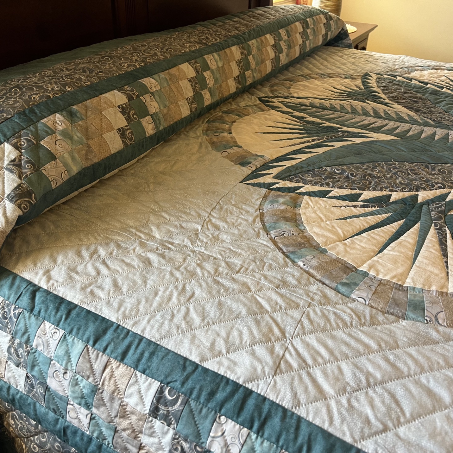 A gorgeous Judy Niemeyer Quiltworx pattern made with her foundation papers. Yes — sewn on paper and then the papers are torn out  gently and Presto — you have perfect curves and points.  A  time consuming method but a fantastic outcome. This quilt is made with 100% quilters cotton fabrics in teals and dusty gray and ivory prints. A 100% cotton fabric is used for the  backing of the quilt in light colors. This quilt has 8 hand quilted stitches per inch.  A very showy and unique quilt.