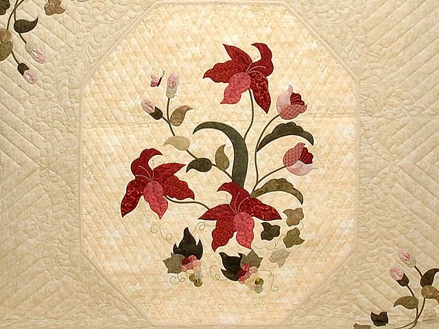 Wow! Super original design by C Jean Horst. Look at the shape of the rose buds and the orchids. Also note the care taken in the use of the rope lace framing the center design and around the border, and the abundance of quilting in the center of the quilt. Signed in embroidery and dated by its designer C Jean Horst. Quilted with care by an Amish woman. Copyright pattern — directions are unavailable.