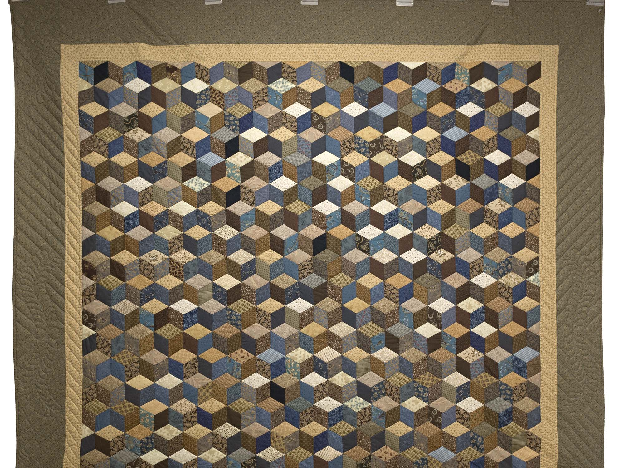 Great collection of Civil War style (blues, golden tans and browns) cotton prints selected by C Jean Horst. Excellent patchwork piecing and lots of fine quilting. Made by Lancaster County Amish woman. This quilt is symmetric and may be used sideways on a king size bed.