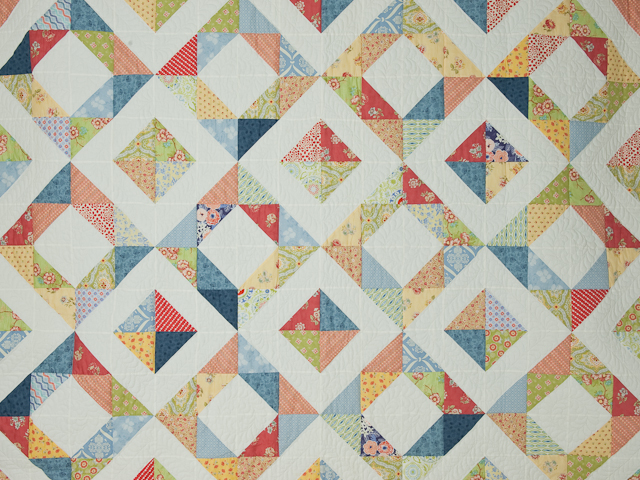 This is a brand new quilt pattern for us and an imaculate display of hand quilting includes several types of feathers. Especially beautiful feather border design (see corner photo) dancing around the entire perimeter of the quilt. The bright fabrics on white are perfect for a perky look and will blend with an assortment of colors. The fabrics are all 100 % cotton.