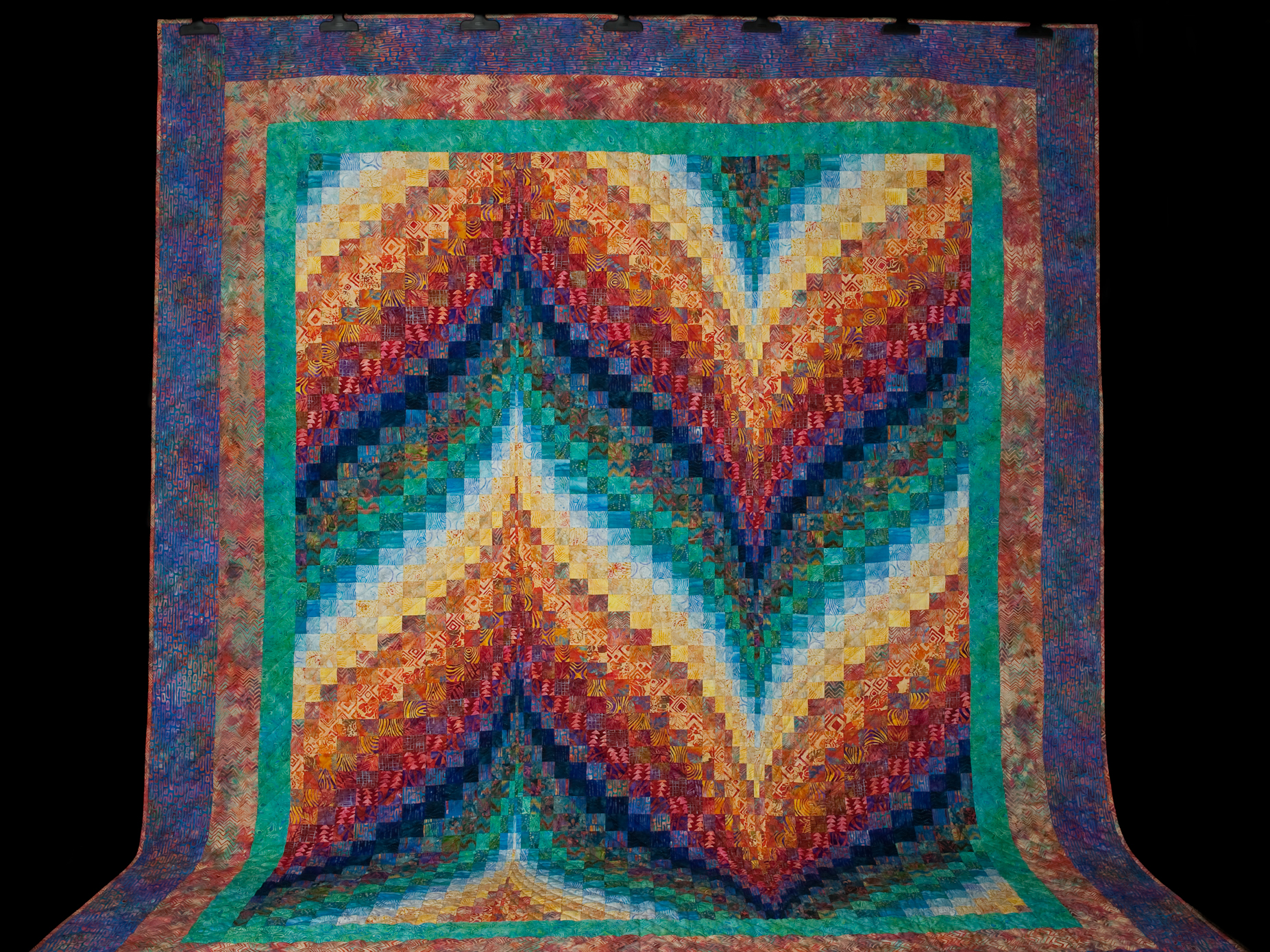 A very striking Bargello design with extra-gorgeous Batik style color fast 100 % cotton prints selected by C Jean Horst. Note the care taken with the complicated piecing, and the fantastic border fabrics. Both pieced and quilted by an Amish friend and signed by C Jean Horst.