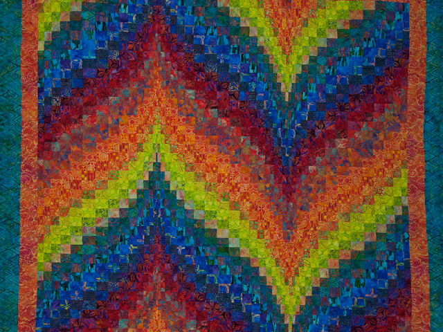 A very striking Bargello design with extra-gorgeous Batik style color fast 100 % cotton prints selected by C Jean Horst. Note the care taken with the complicated piecing, and the fantastic border fabrics. Both pieced and quilted by an Amish friend and signed by C Jean Horst. This quilt is symmetric and may be used sideways on some king size beds.