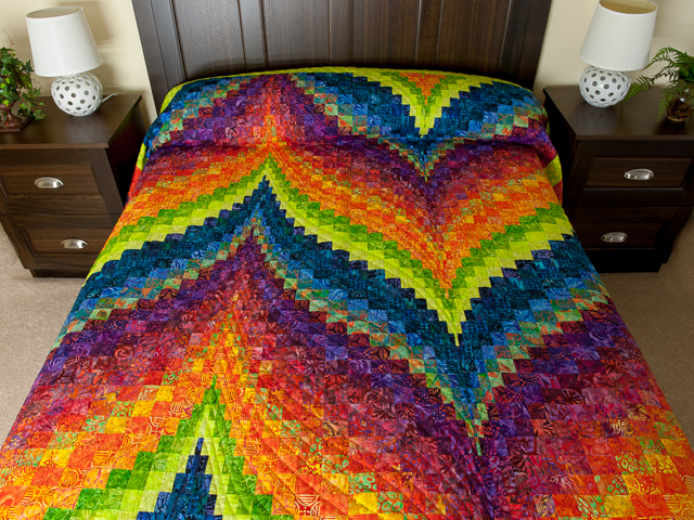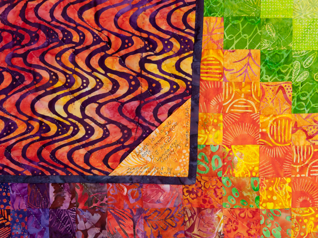 A very striking Bargello design with extra brilliant Batik style color fast 100 % cotton prints selected by C Jean Horst. Note the care taken with the complicated piecing, and the fantastic border fabrics. Both pieced and quilted by an Amish friend and signed by C Jean Horst. This quilt is symmetric and may also be used sideways on king size beds or this quilt would make a spectacular wall quilt in a perfect space.