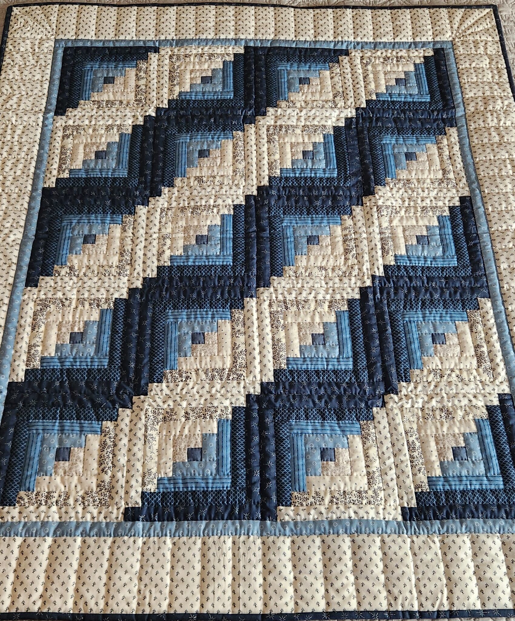A classic log cabin quilt in lovely shades of blue. Perfect for a crib quilt or wall hanging. The fabrics blend together beautifully. None of the prints are overly floral with most being a leafy print. The back of the quilt is covered with the same dot fabric as used on the border. Well made by Pennsylvania Mennonite quilt maker, Connie Lapp, and delicately hand quilted by a Mennonite friend. This quilt is sure to be a treasured heirloom!