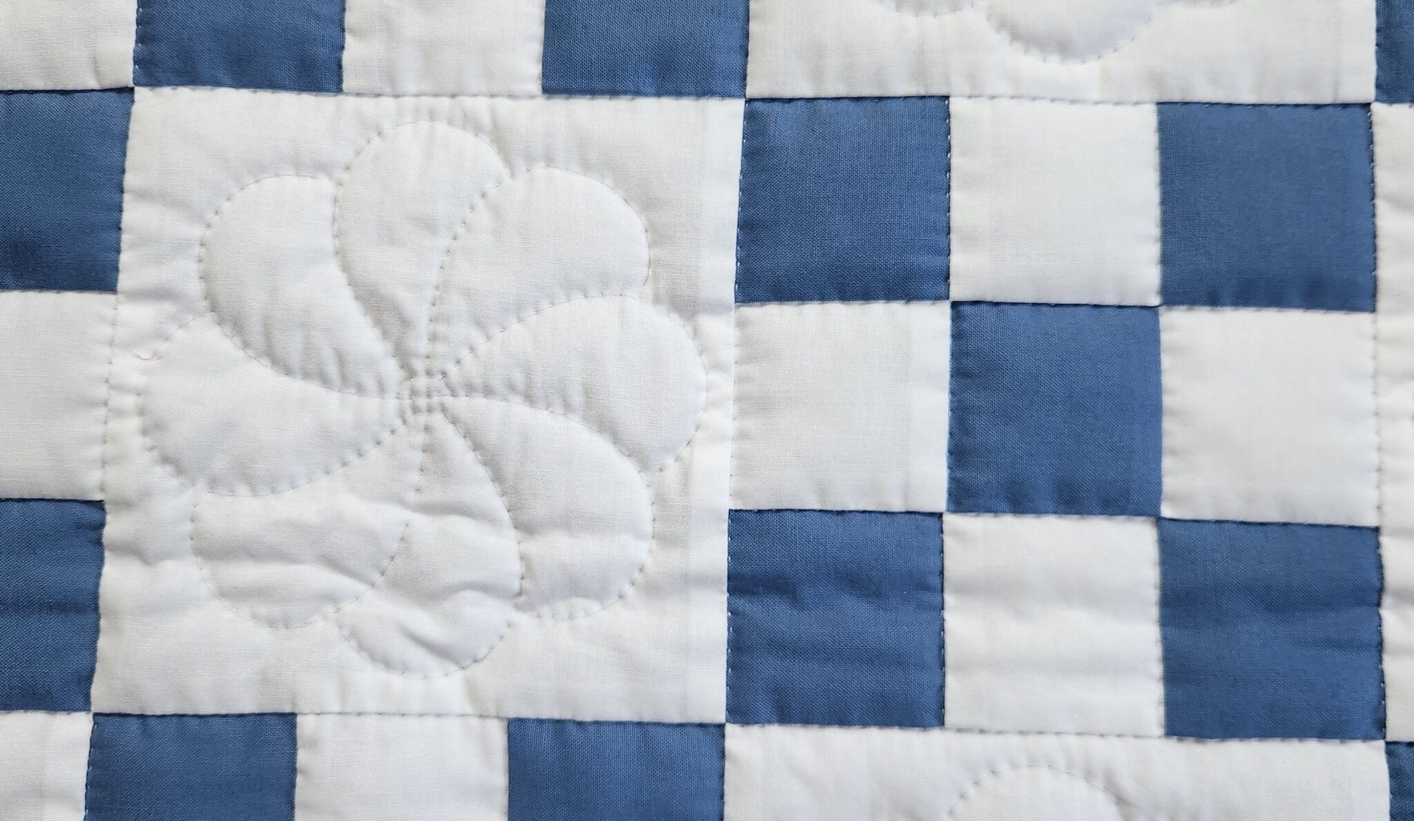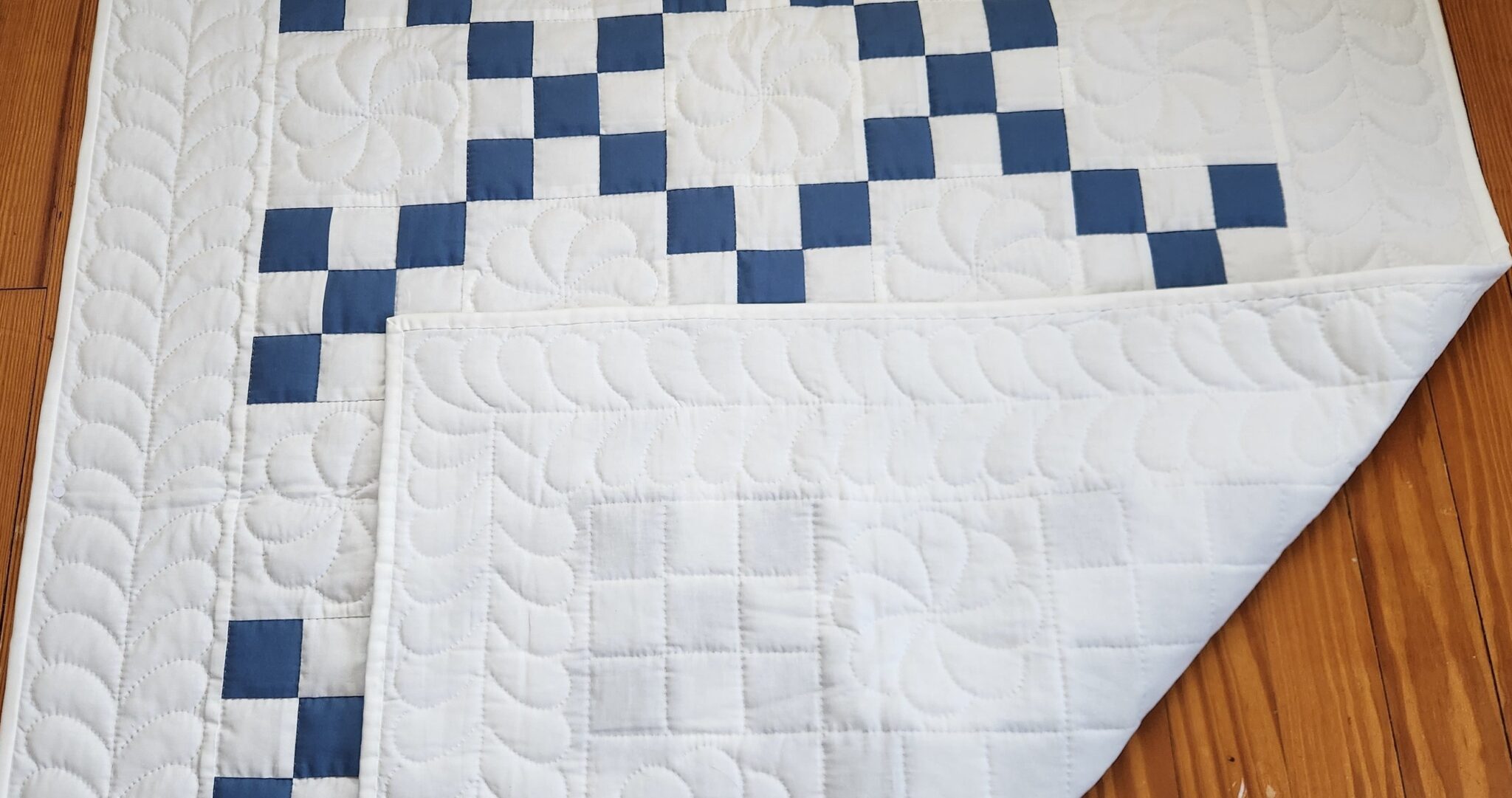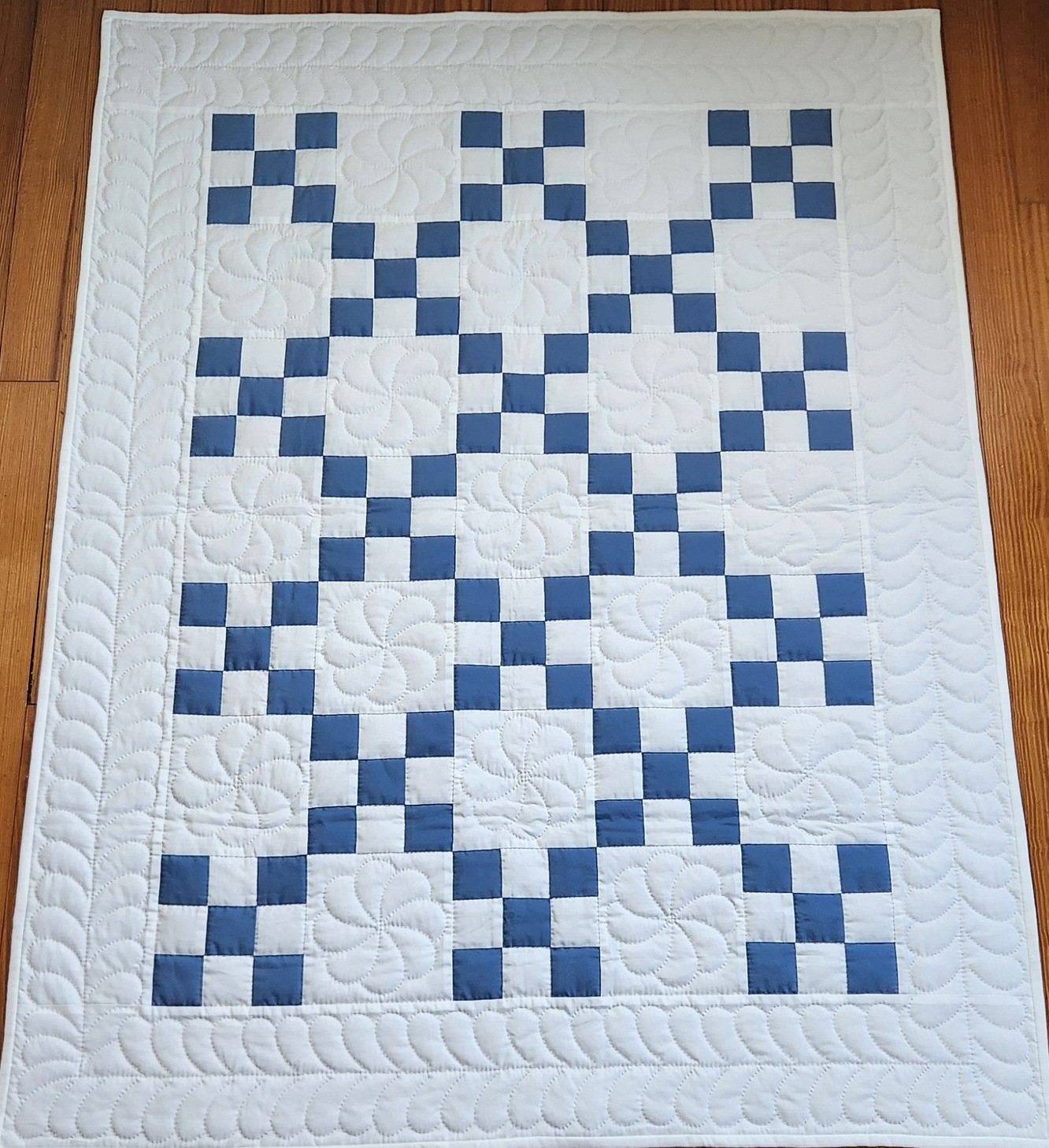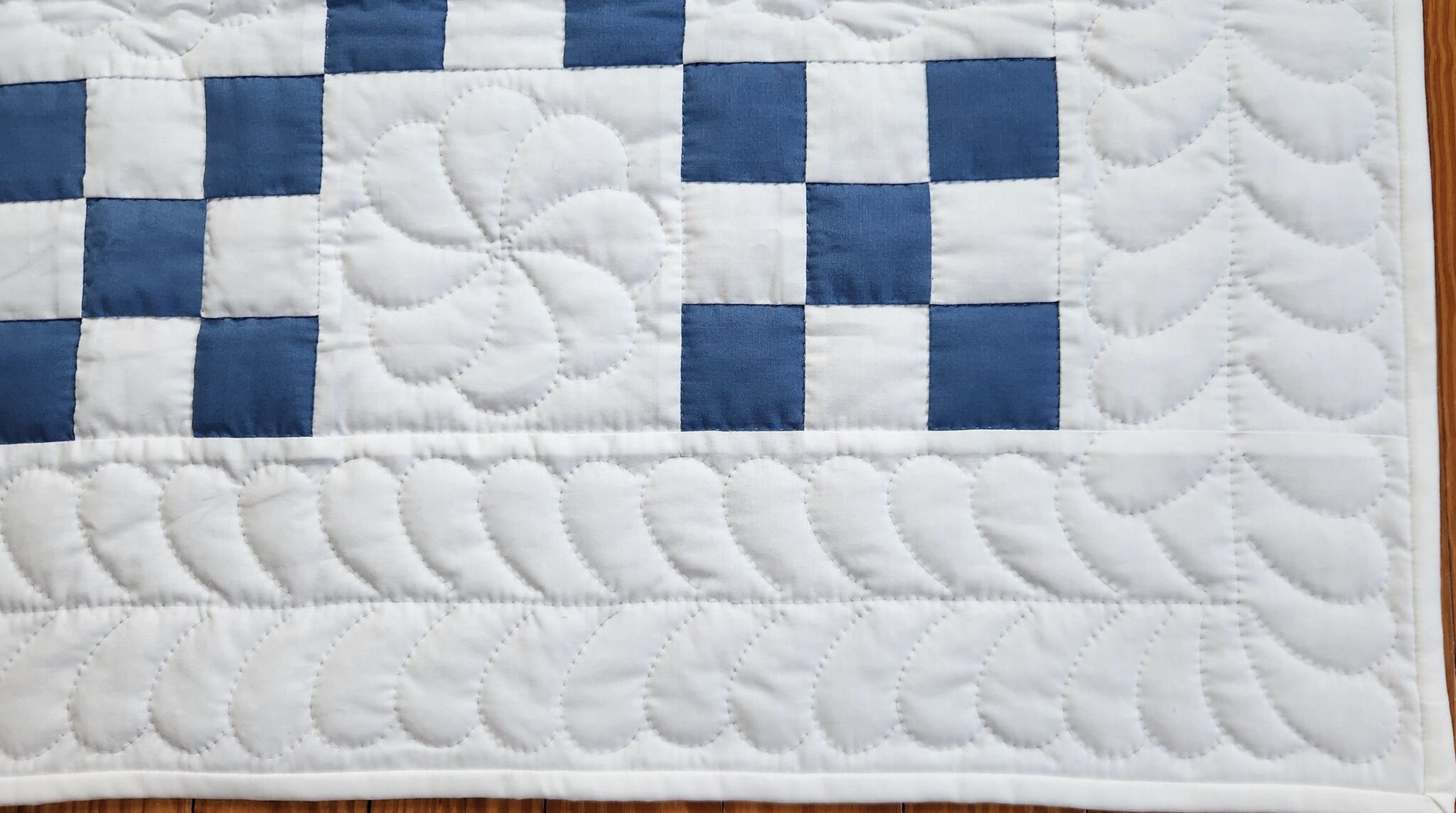 A very elegant Nine Patch Quilt in the most beautiful blue! The back of the quilt is covered with the same white fabric as used on the front. Be sure to notice the incredible hand quilting! Well made by Pennsylvania Mennonite quilt maker, Connie Lapp, and hand quilted by a Mennonite friend. A great gift for a special new baby.