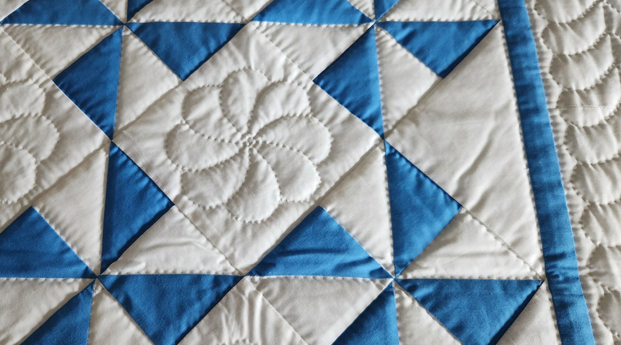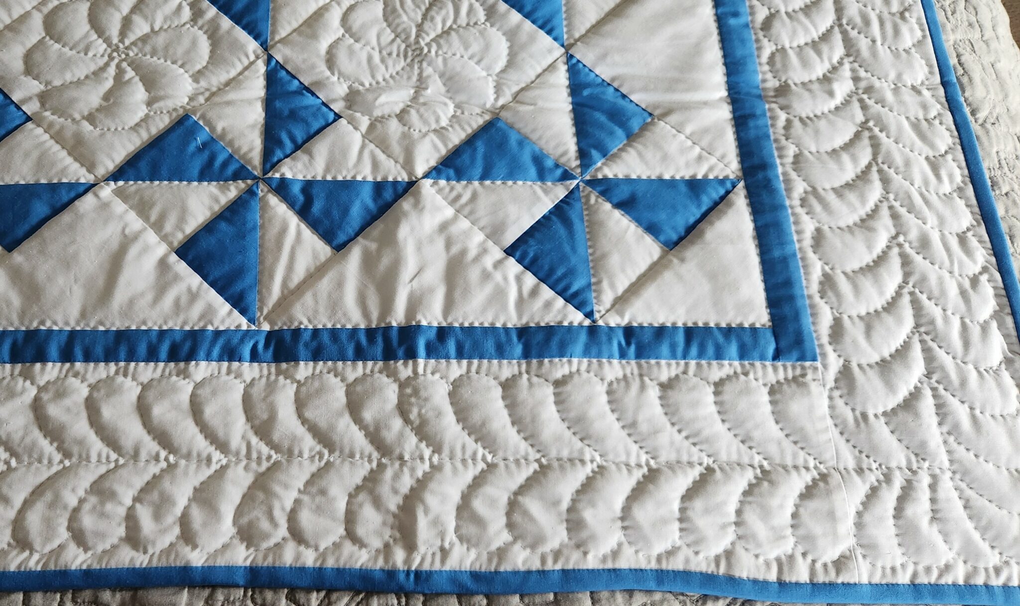 A classy take on a classic design! A lovely blue set in solid white with a pretty print back. A very well made quilt with precise piecing and lots of fine hand quilting. The quilt top was made in Lancaster County, Pennsylvania by the Mennonite quilt designer, Connie Lapp, and hand quilted by a Mennonite friend. A great gift idea!
