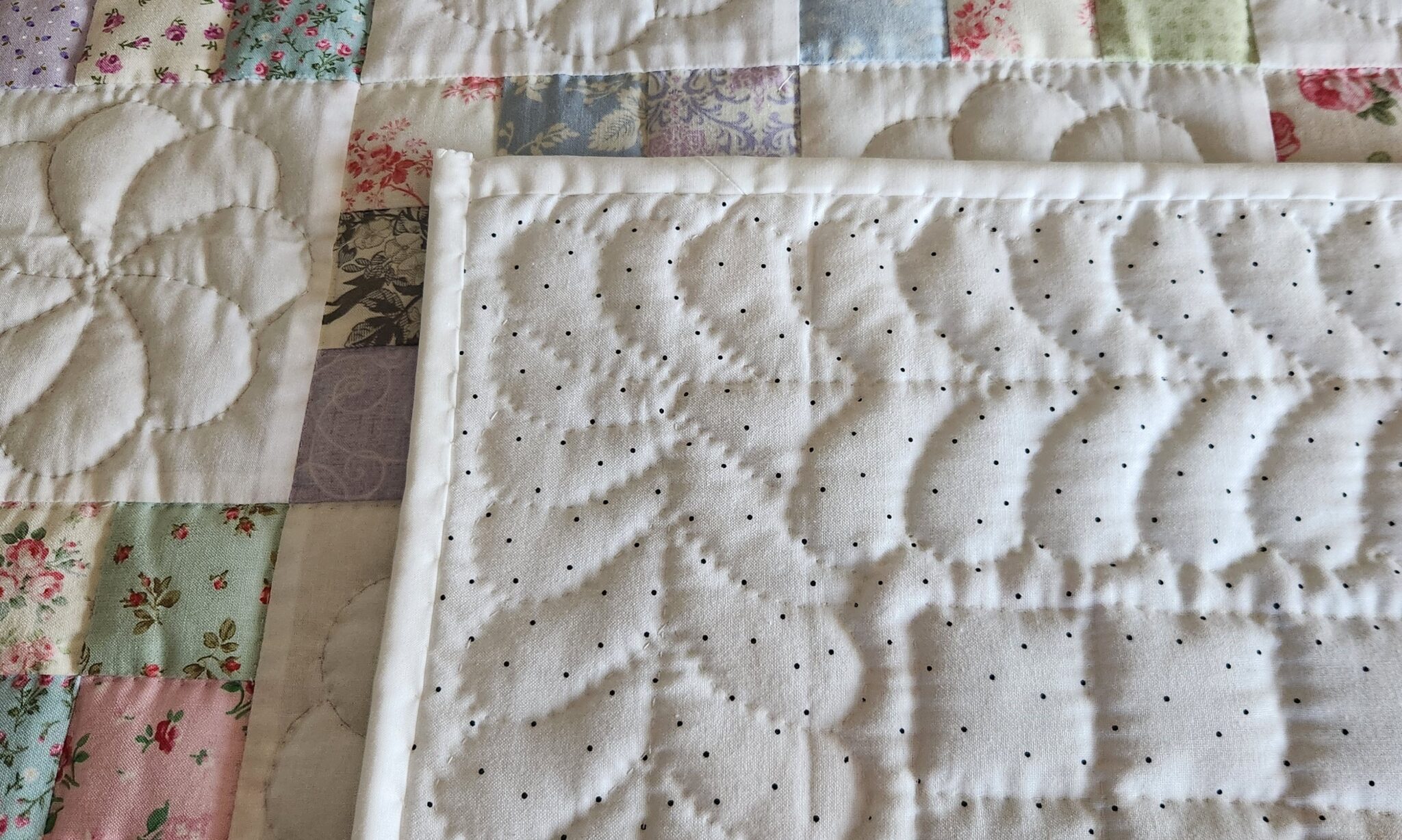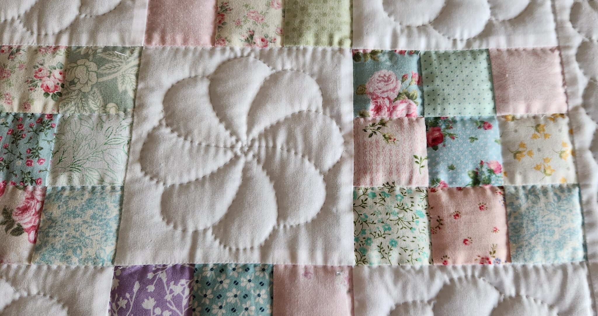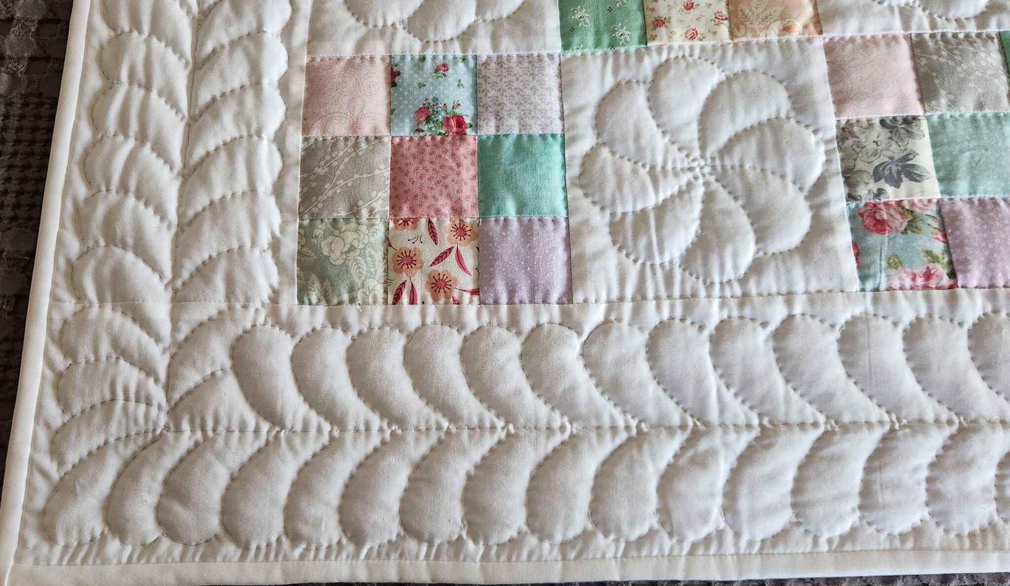 A tender quilt just like Grandma used to make! A soft and lovely collection of pastel prints chosen just for this quilt. The back of the quilt is covered with a delicate print fabric that compliments the quilt perfectly.  Abundant and beautiful hand quilting. Perfectly pieced. The quilt top was made by Pennsylvania Mennonite quilt designer, Connie Lapp, and hand quilted by a Mennonite friend. Sure to be a treasured heirloom for a sweet baby!