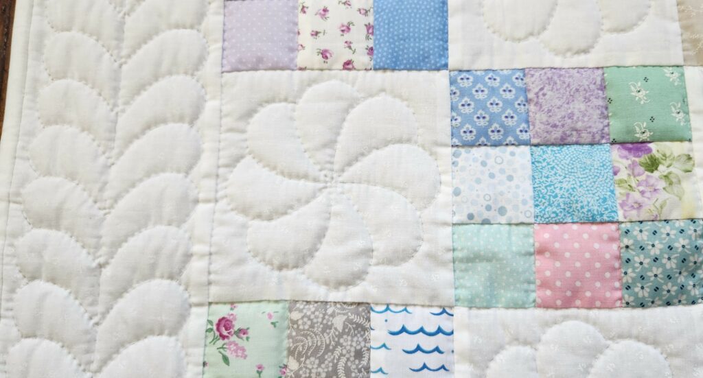 Pastel and White Nine Patch Crib Quilt (Pink Binding)