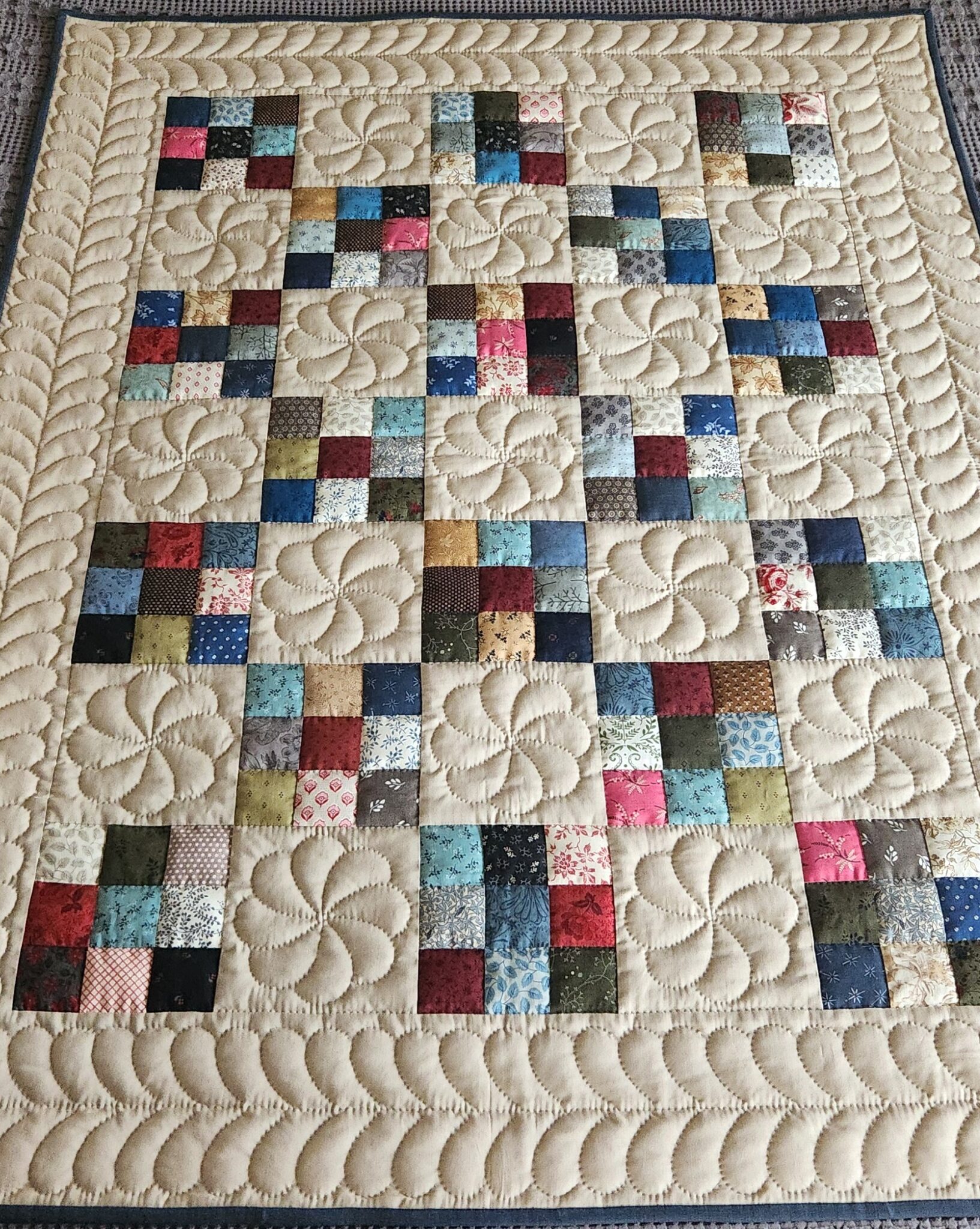 A classic nine patch quilt featuring a collection of beautiful print fabrics chosen just for this quilt. The back of the quilt is covered with a gorgeous print fabric. The edge binding is a lovely navy blue. Be sure to notice the incredibly fine hand quilting. Well made by Pennsylvania Mennonite quilt maker, Connie Lapp, and hand quilted by a Mennonite friend. This quilt would make a fantastic crib quilt or wall hanging!