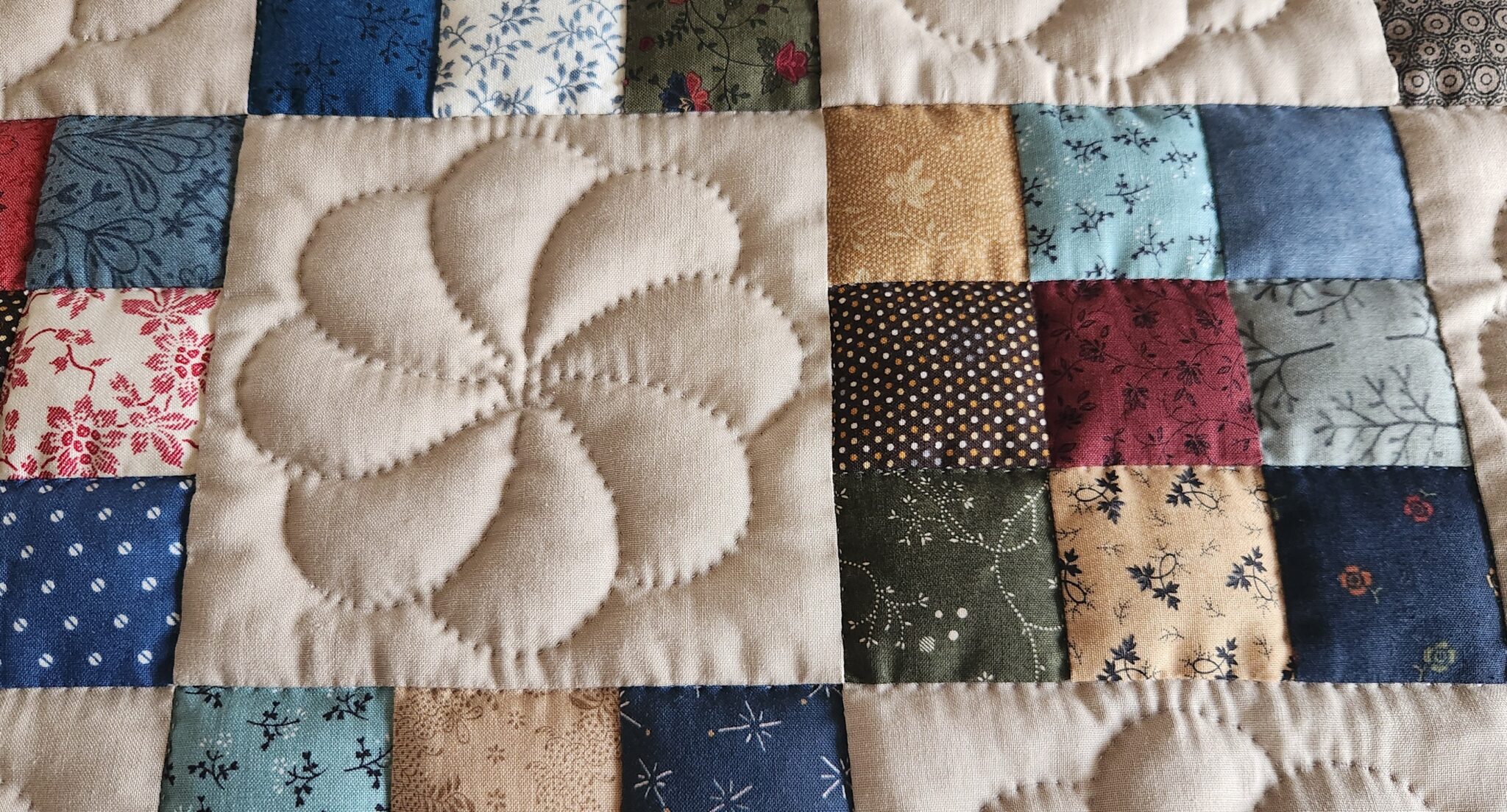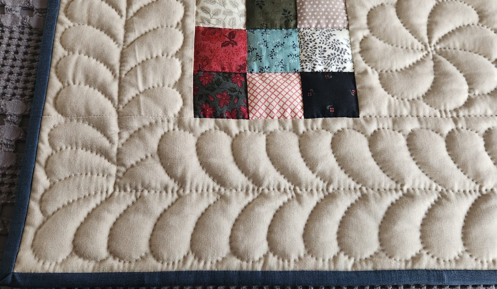 • Soft and pretty fabrics of natural and a watercolor floral! Amazing hand quilted border design! A quilt that would be perfect as either a wall hanging or a crib quilt. Very well made! The top was pieced by Pennsylvania Mennonite quilt maker, Connie Lapp, and was hand quilted by her mother.