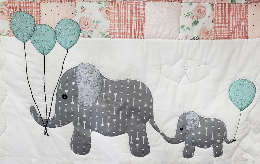 A sweet ‘Mommy and Me’ baby quilt made in soft peach colors with patchwork squares and a plaid top and bottom, and the gray elephants toting teal color balloons across a white background, and the gray rick-rack ribbon is a nice embellishment to the quilt. The backing is in a gray print fabric.