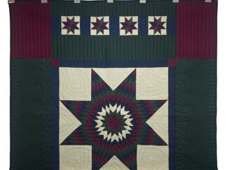 $1,050Sharp traditional design! The star stands out brilliantly against the blue surround. The sash is forest green, and the border dark blue with bright red corner squares. Note the extra stars on the pillow fold. Made with thin batting and all-cotton fabric to give look and feel of an antique quilt. Well made by Lancaster Amish woman who has included her initials in the quilting. -