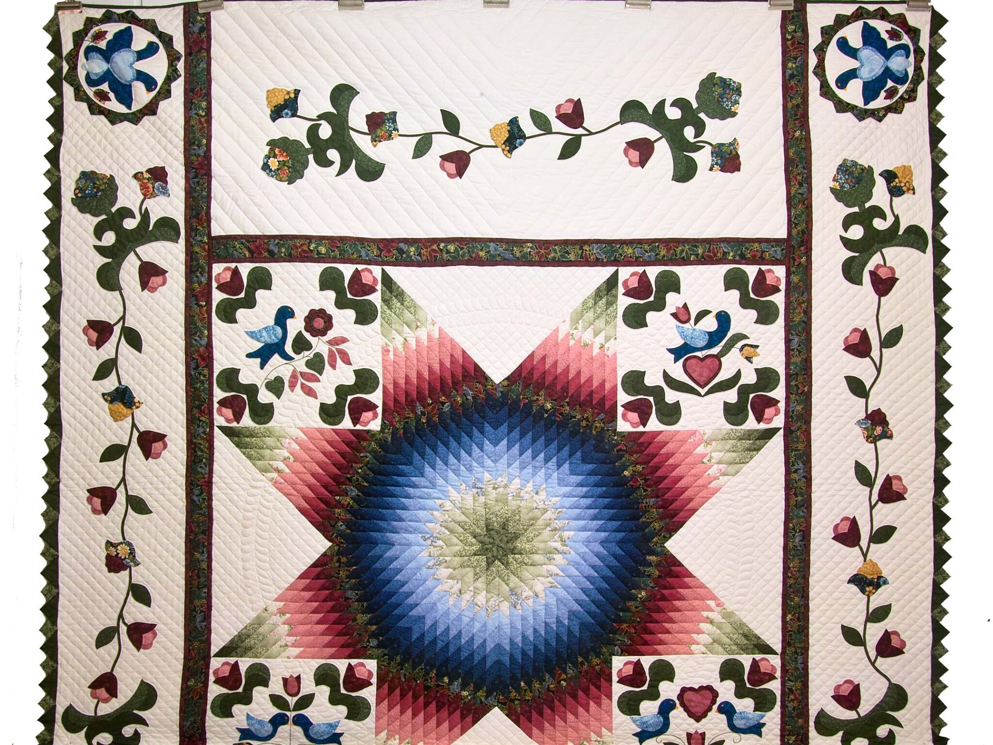 Wow! Razor sharp patchwork, wonderful applique work and an abundance of quilting coupled with gorgeous fabric selections. This quilt has every thing that makes Lancaster quilts treasured around the world. Note the toothed borders and brilliant sash. Made by local Amish woman who placed her initials (in ink) on the quilt back.