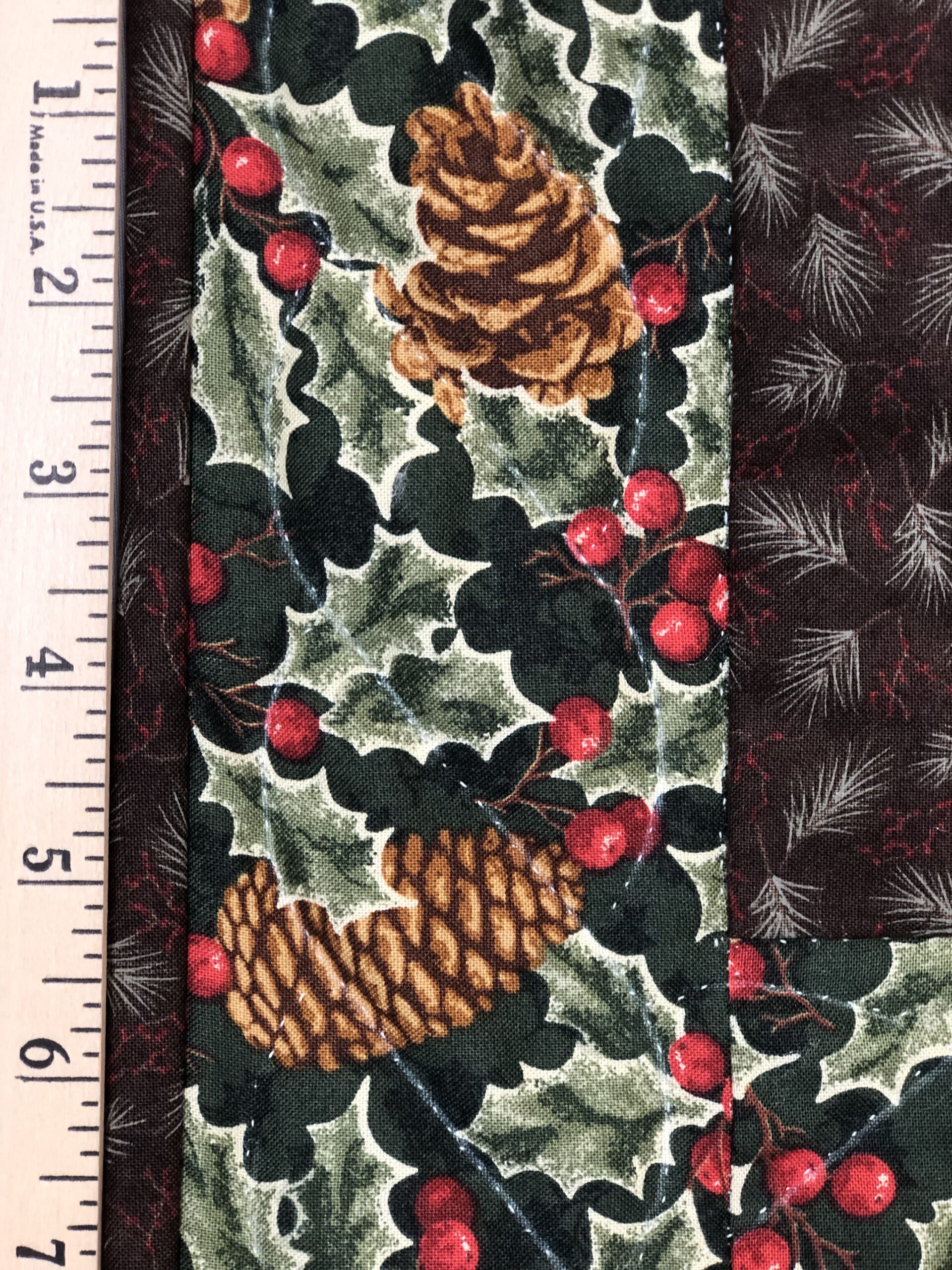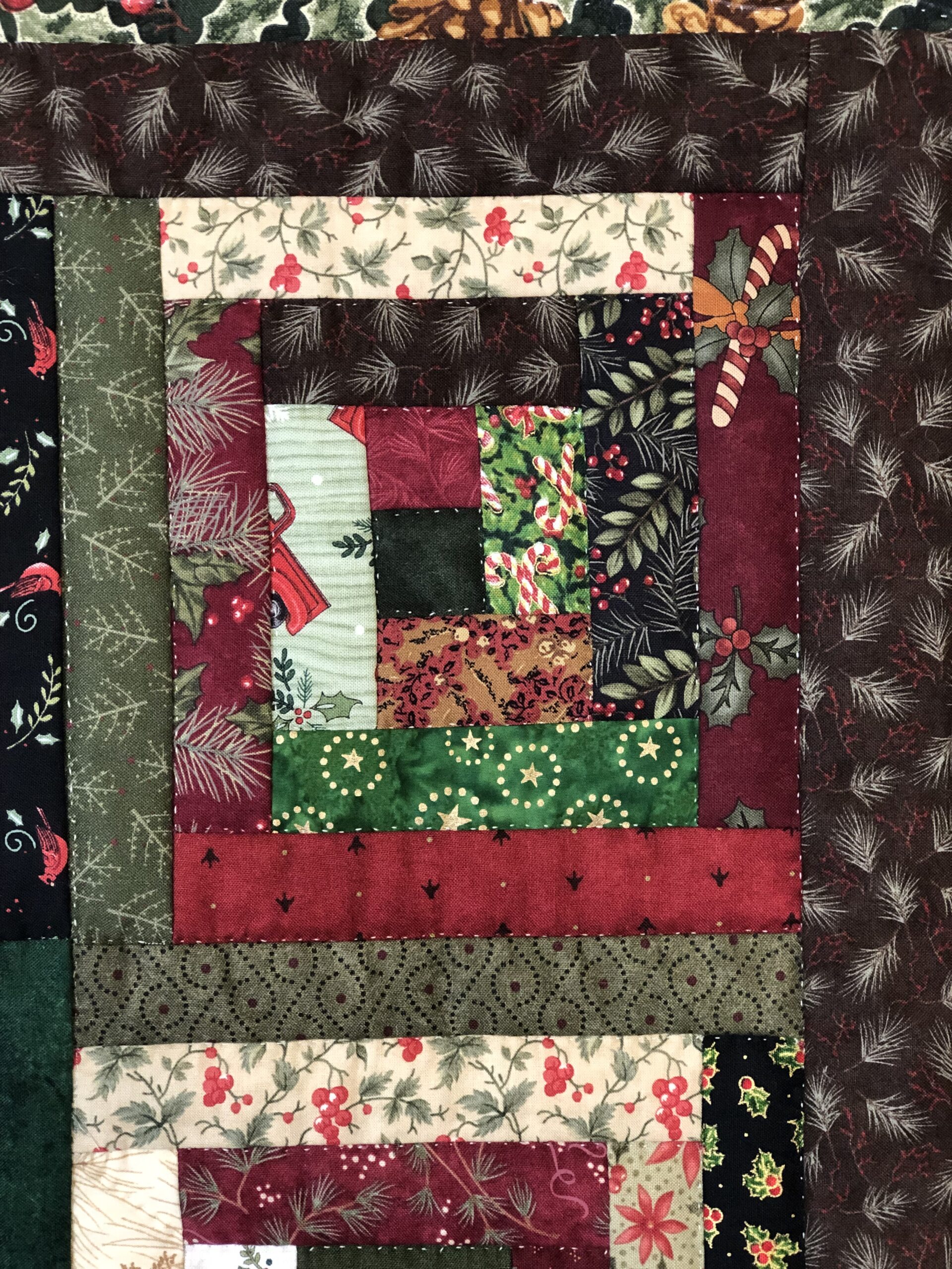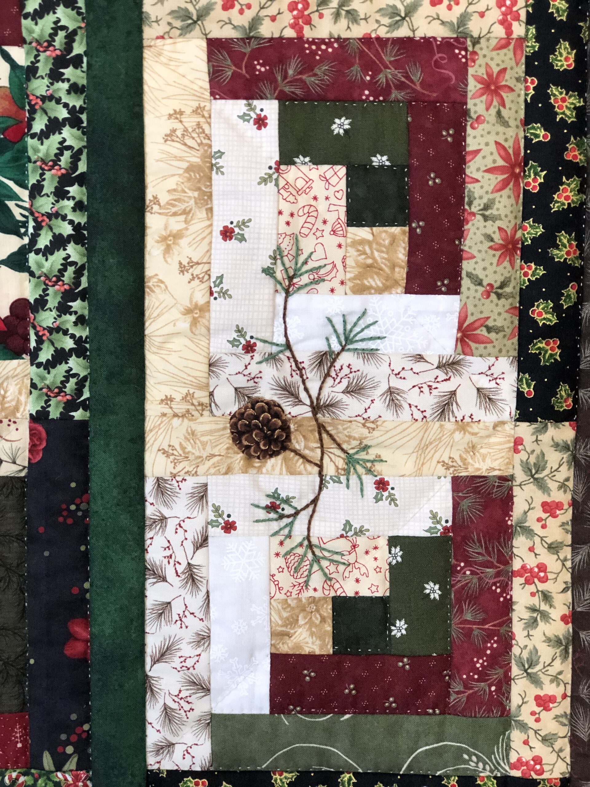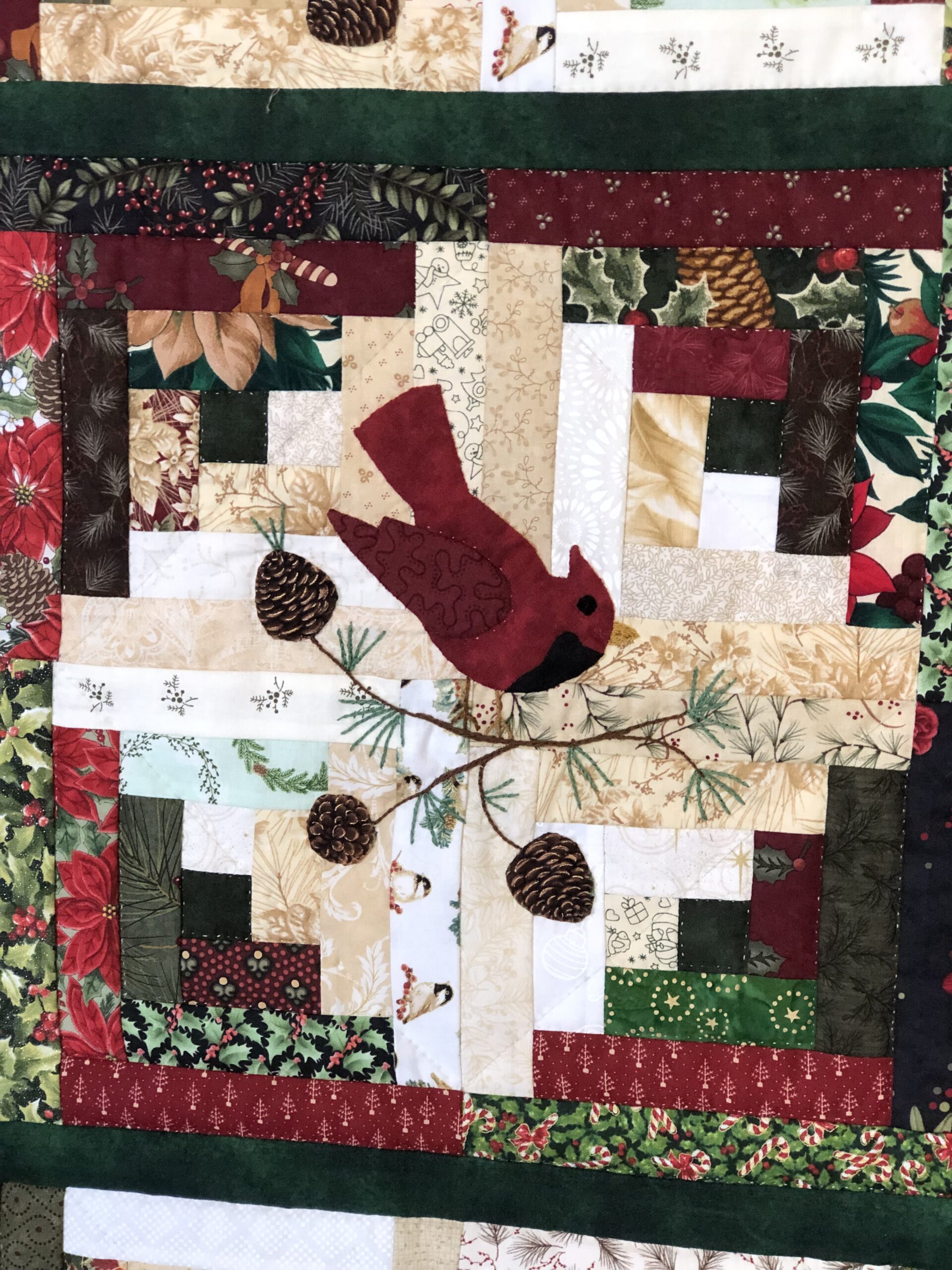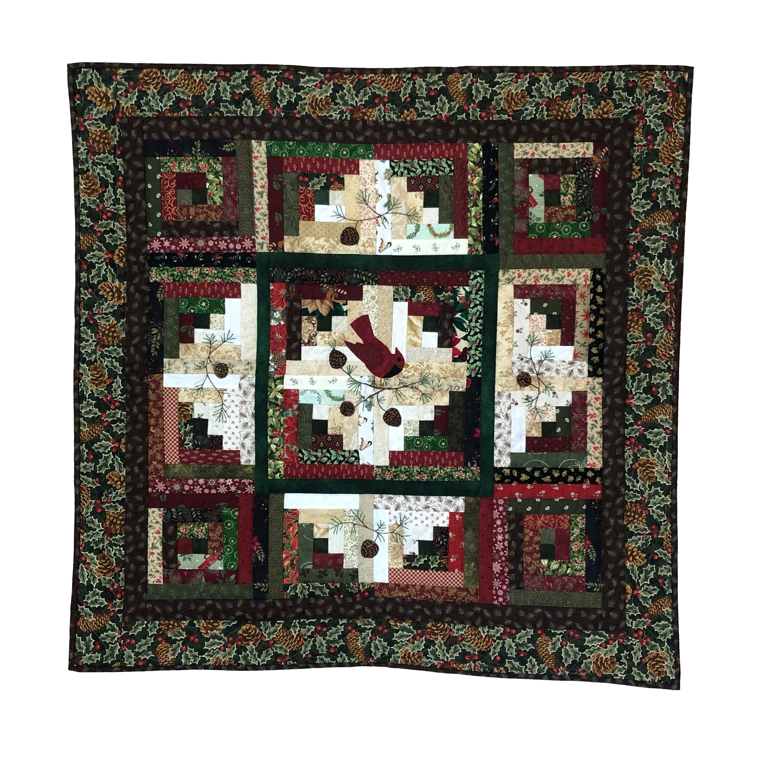 A Perky red Cardinal is at the center of this log cabin Christmas quilt. The log cabin blocks have been artfully arranged using lights and darks to create the backdrop for this festive holiday piece. Hand appliquéd pinecones and hand embroidered pine needles add to the seasonal felling as well. Look closely at all the fun fabrics that Karel incorporates to create the logs for the blocks. Small hand quilted stitches enhance the beauty of this original design and holly berries along with pinecones on the border fabric finish the quilt beautifully.