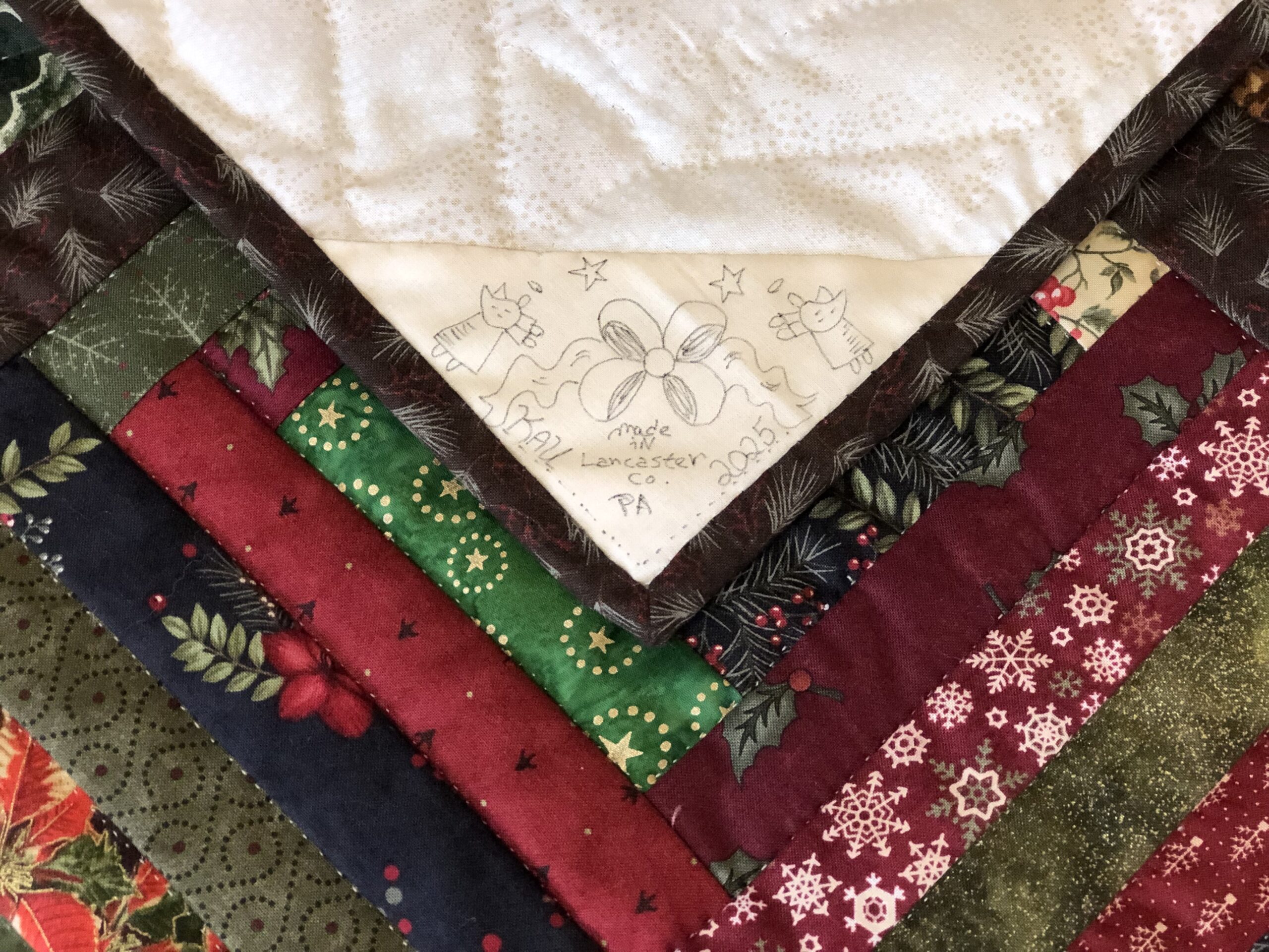 A hanging sleeve and Karel’s signature patch are included on the back of the quilt.