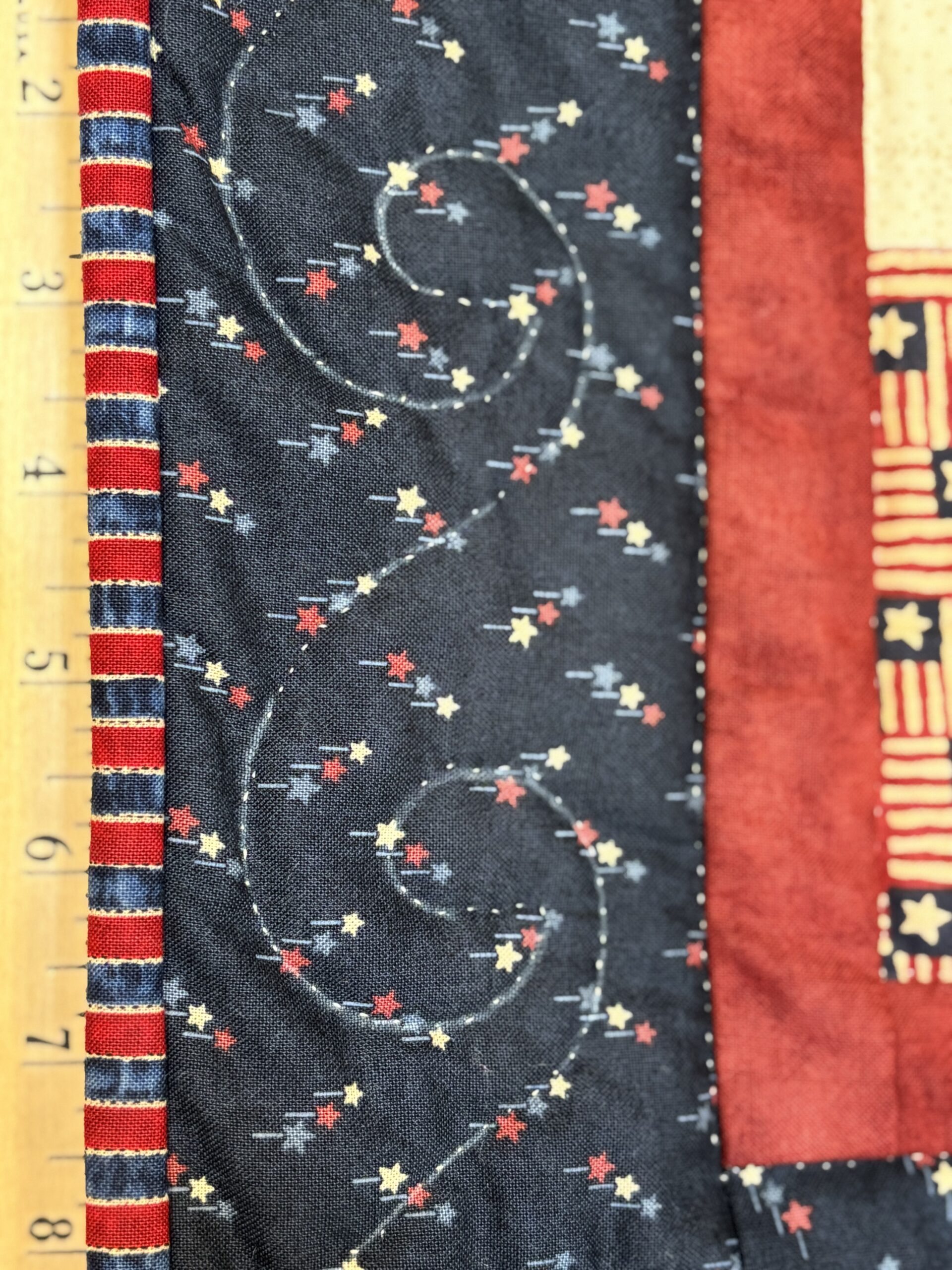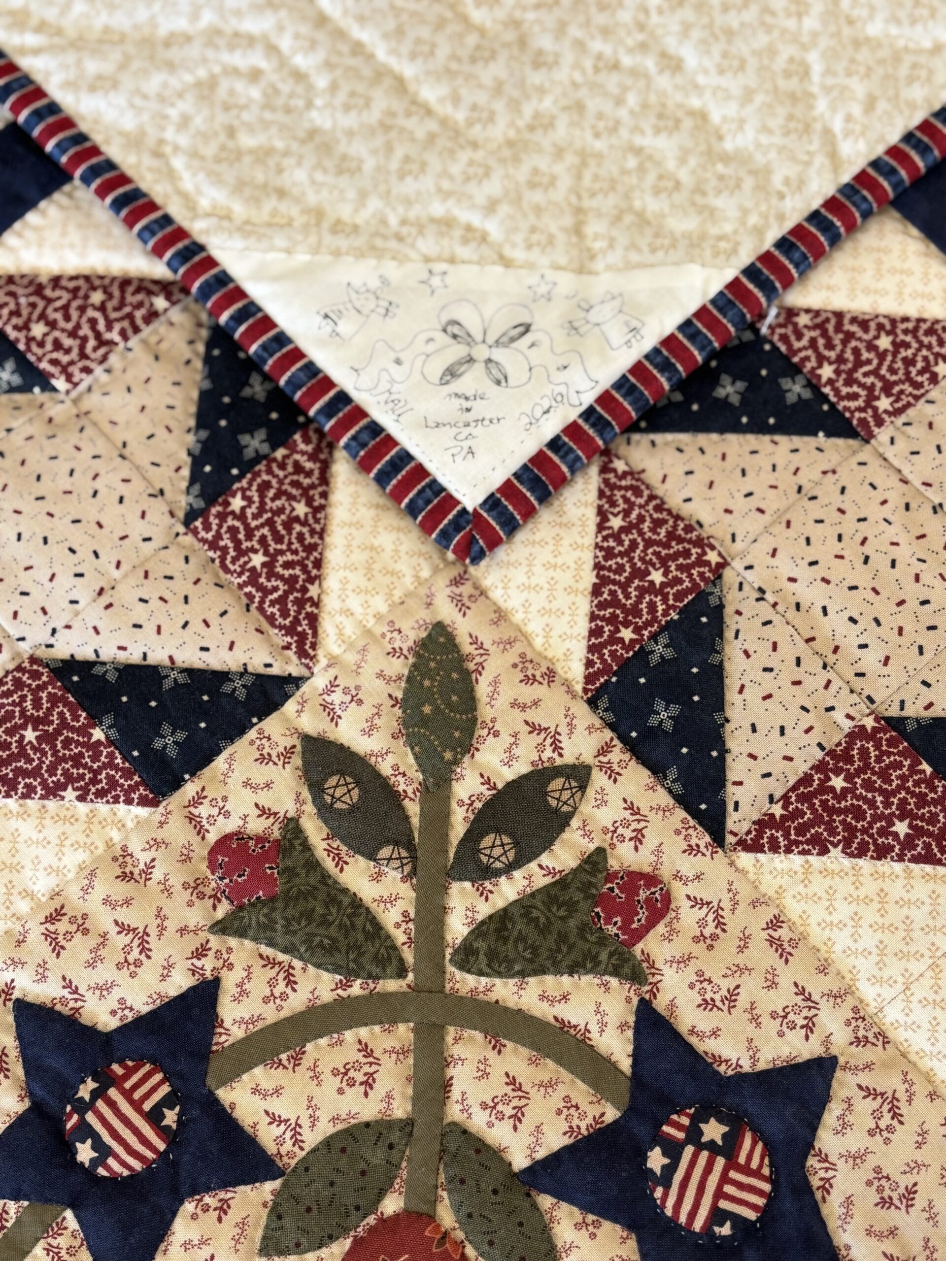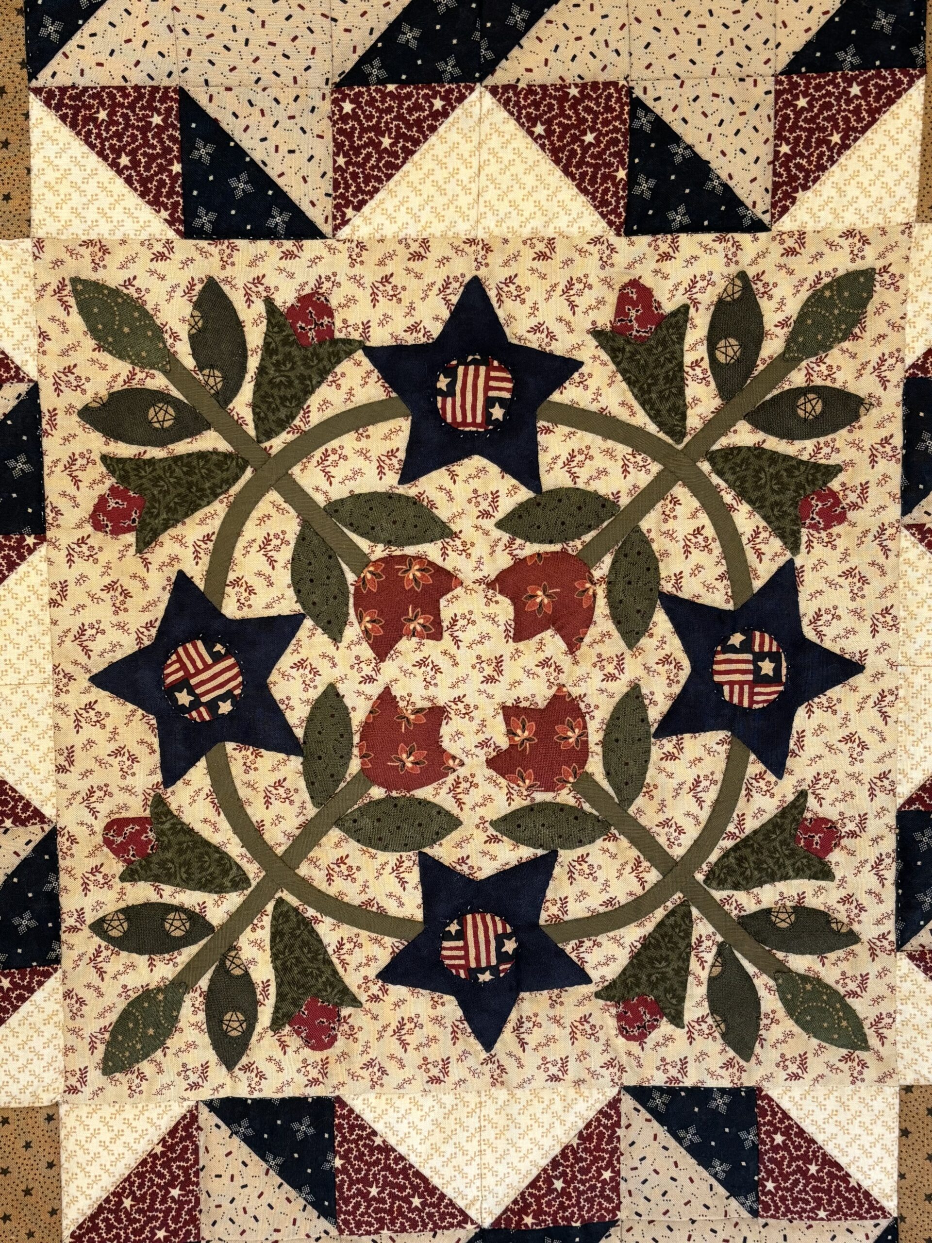 A graceful hand appliquéd wreath featuring star flowers is the center focal point of this stunning small quilt. Tuilips and buds along with corner shield blocks give this quilt an Americana feel. Ribbon star blocks surround the central wreath along with a checkerboard border. The workmanship both in appliqué and the hand-quilting has been beautifully done on this patriotic quilt.