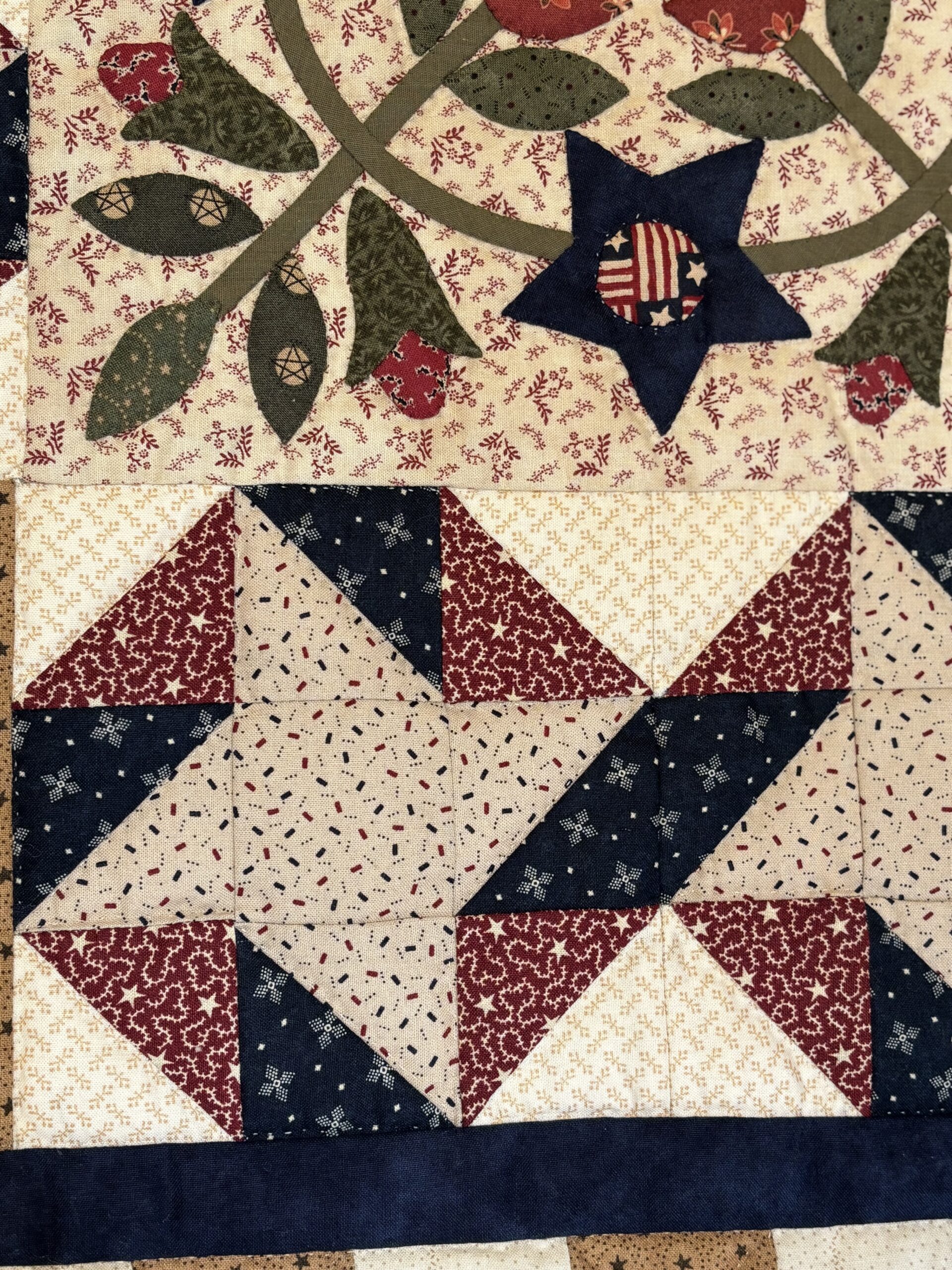 • The classic Whig Rose appliqué block has been used along with the 8-pointed star block in this design.  The clever placement of light and dark fabrics have created a unique, secondary border design that flows around the blocks .  A lovely floral design is hand-quilted in the other 4 blocks for contrast.  New England red, hunter green, mustard and navy with a touch of black make up this classic color scheme and look wonderful next to the tan and ivory background squares.  The hand quilting is tiny and precise and the appliqué is also beautifully done. A hanging sleeve and Karel's signature patch are included on the back.