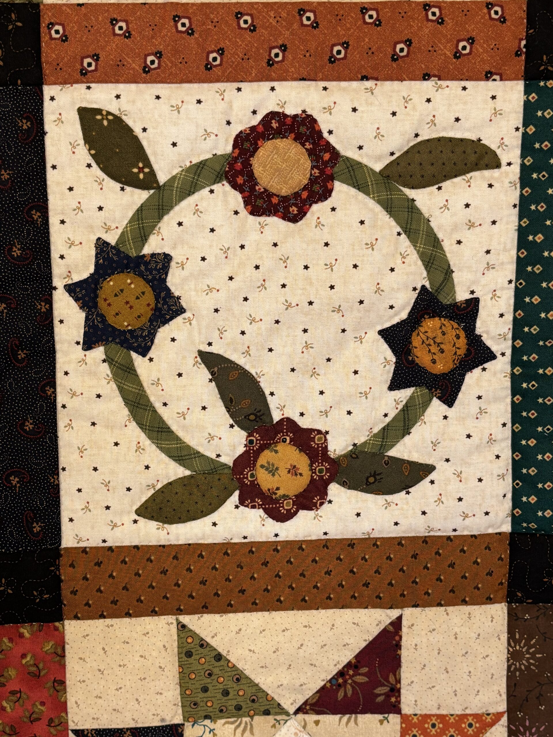 This delightful quilt came about as a result of Karel’s love of Dresden Plates, and star blocks. The floral wreath in the center has been surrounded with appliquéd Dresden Plates and 8-pointed stars with a flower in the center. For added interest Karel chose to use different fabrics in the sashing surrounding the blocks for a scrappy look. The red border chosen frames the blocks just right.The hand work on this quilt is expertly done from the hand applique to the hand quilting.