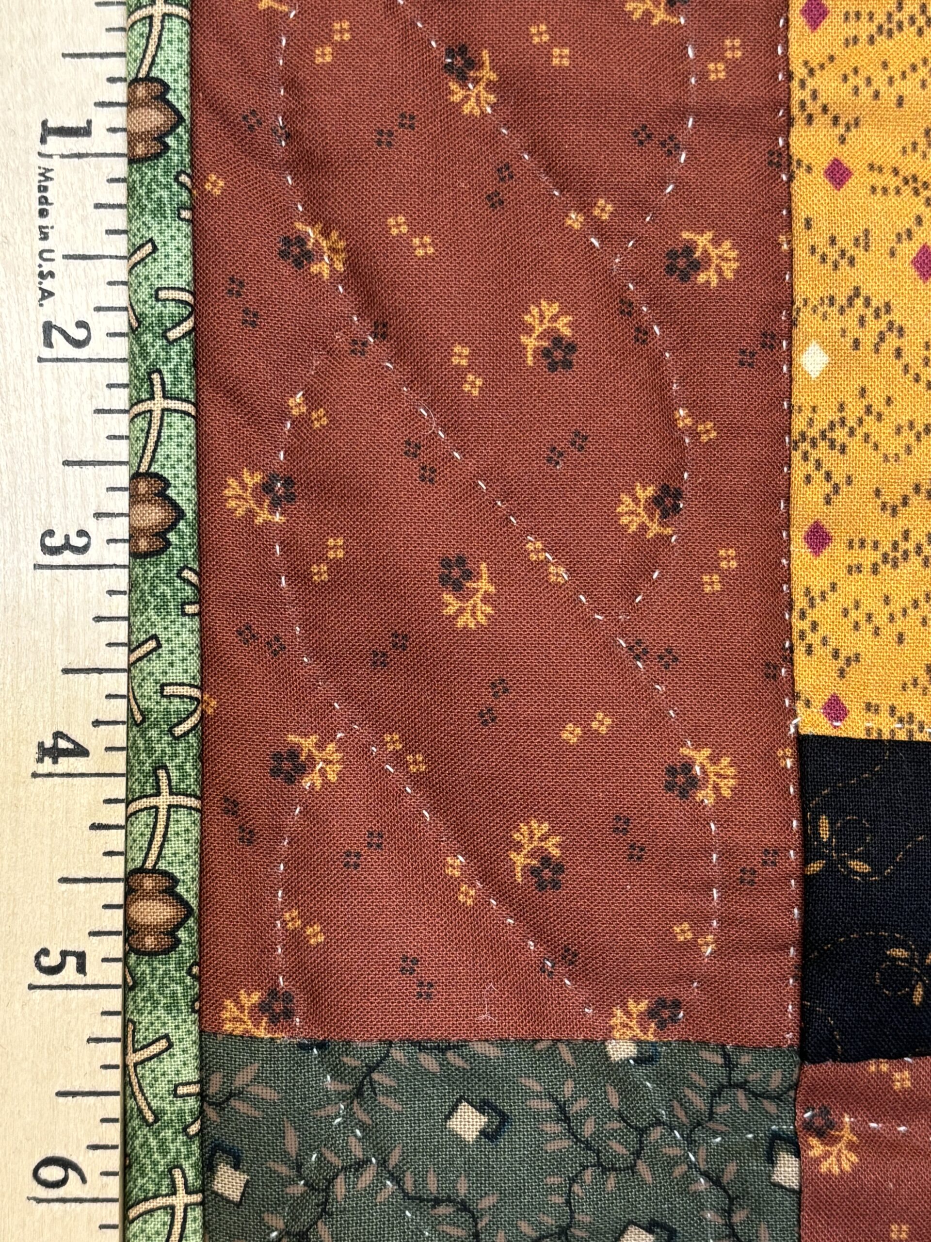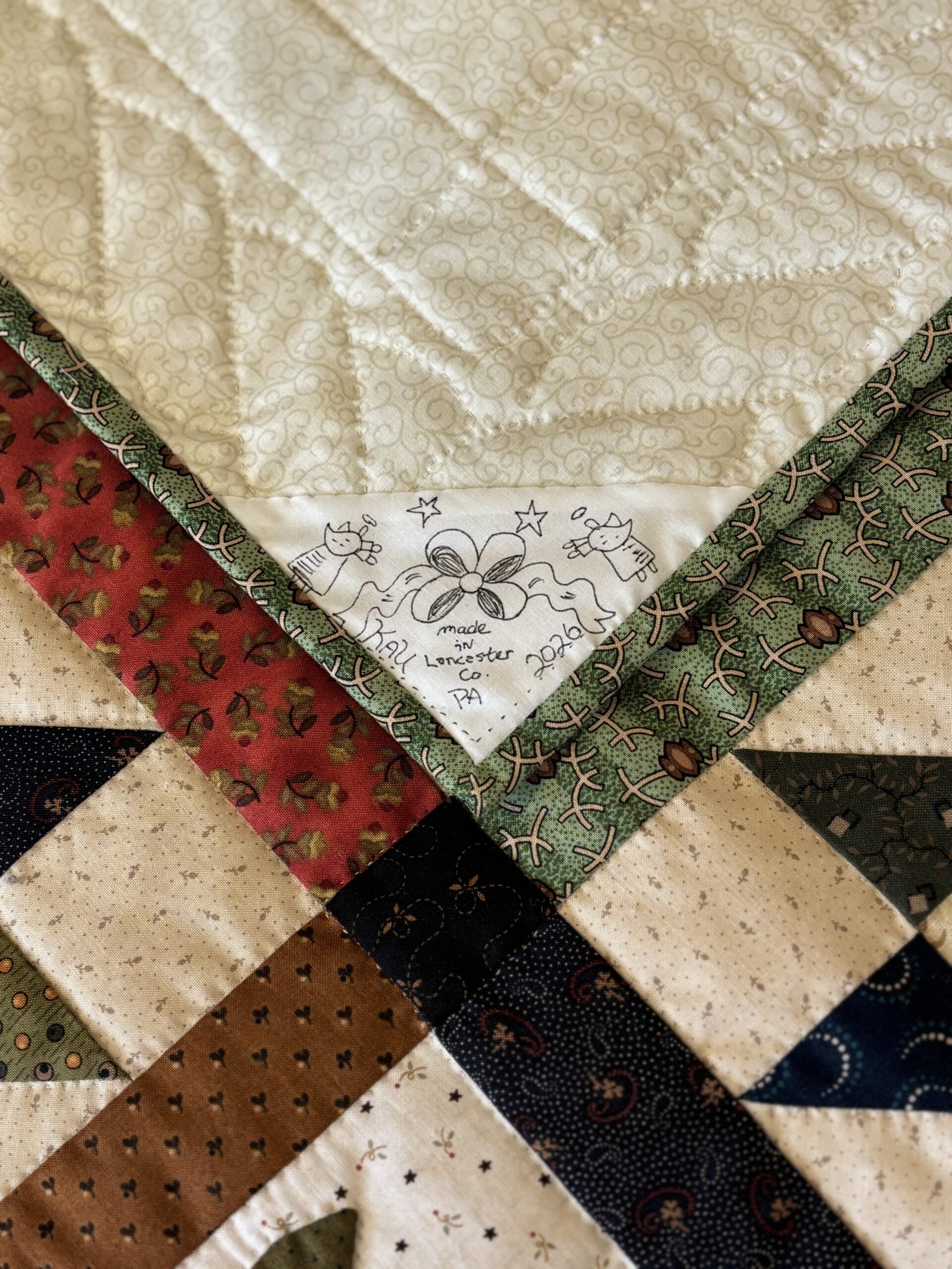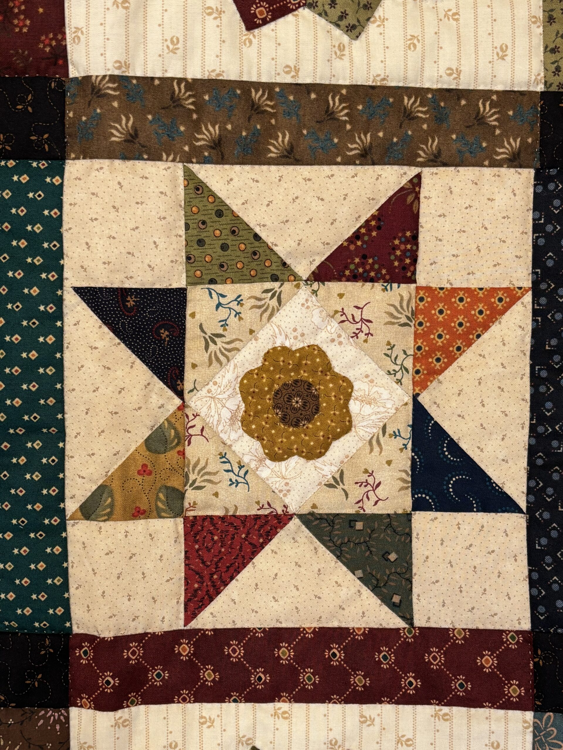 • The classic Whig Rose appliqué block has been used along with the 8-pointed star block in this design.  The clever placement of light and dark fabrics have created a unique, secondary border design that flows around the blocks .  A lovely floral design is hand-quilted in the other 4 blocks for contrast.  New England red, hunter green, mustard and navy with a touch of black make up this classic color scheme and look wonderful next to the tan and ivory background squares.  The hand quilting is tiny and precise and the appliqué is also beautifully done. A hanging sleeve and Karel's signature patch are included on the back.
