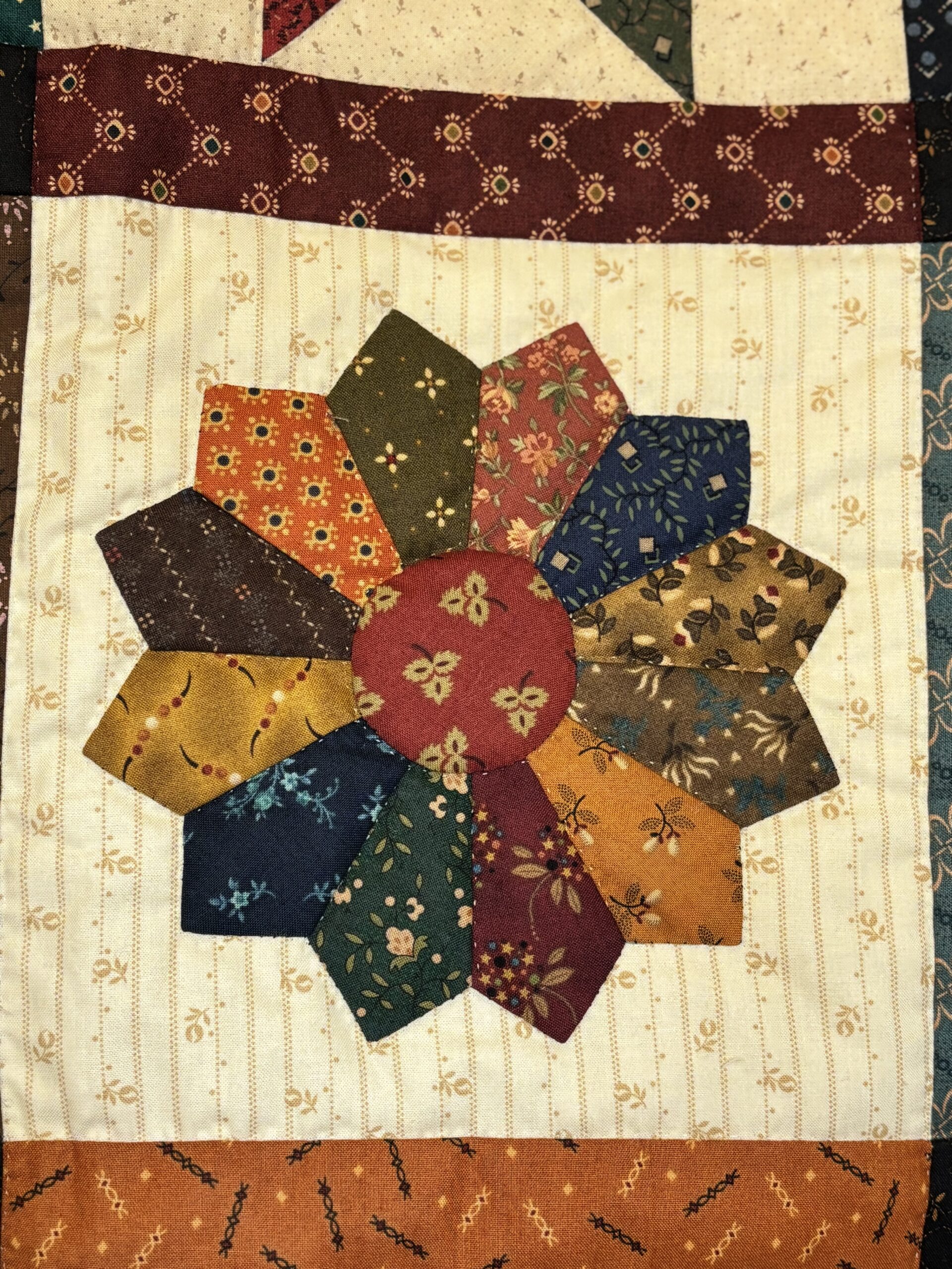 • Late summer is Karel's favorite time of the year and was the inspiration for this fun small quilt.  A sunflower bud and sunflower have been created using the Dresden plate pattern, an appliquéd wool center with french knots and prairie points were added  on the flower.  A bumble bee flies happily around the flower as orange pumpkins sit underneath. The black crow perched on the pumpkin is another detail using wool appliqué.  A combination of machine pieced churn dash and 9-patches blocks were chosen to complete this quilt.  The hand appliqué and quilting  beautifully enhance the design as well. A hanging sleeve and Karel's signature patch  are included on the back.