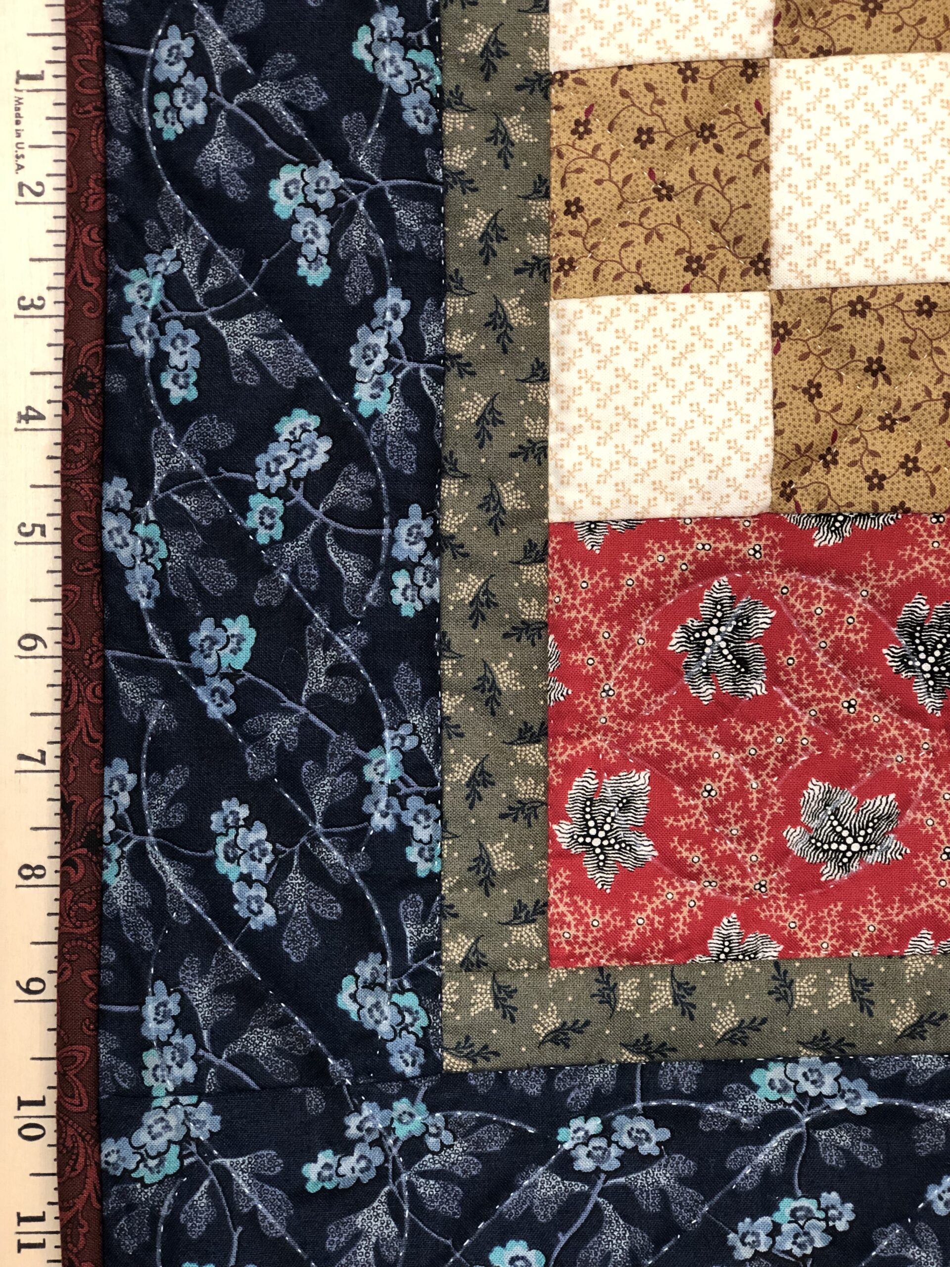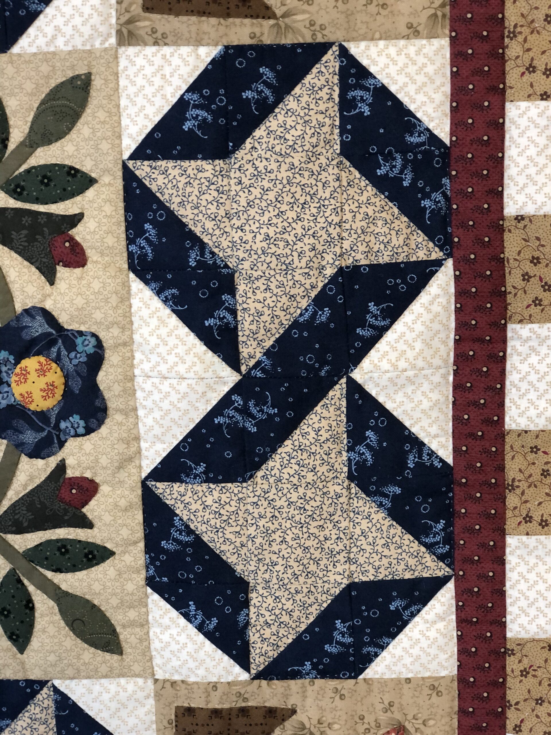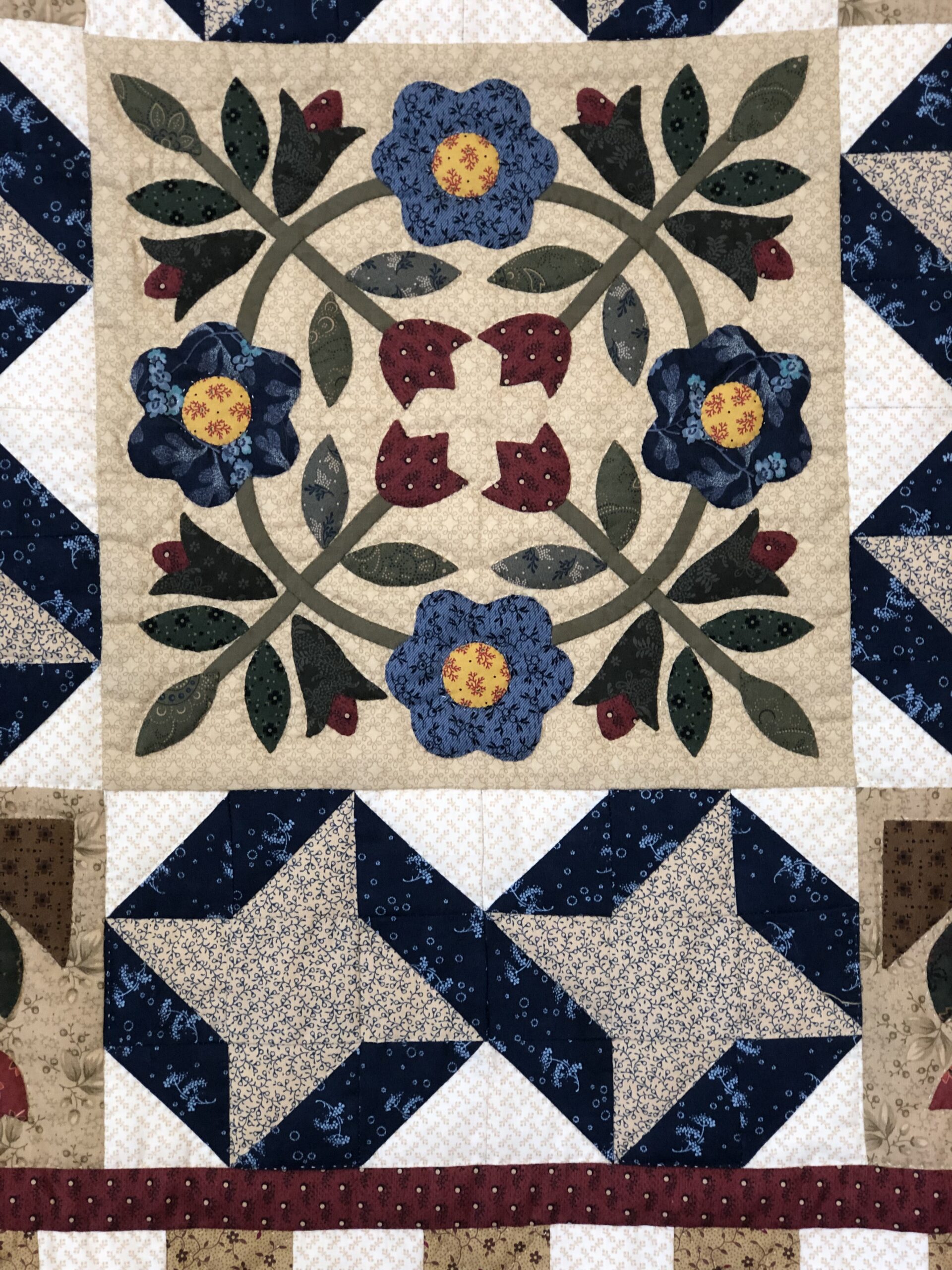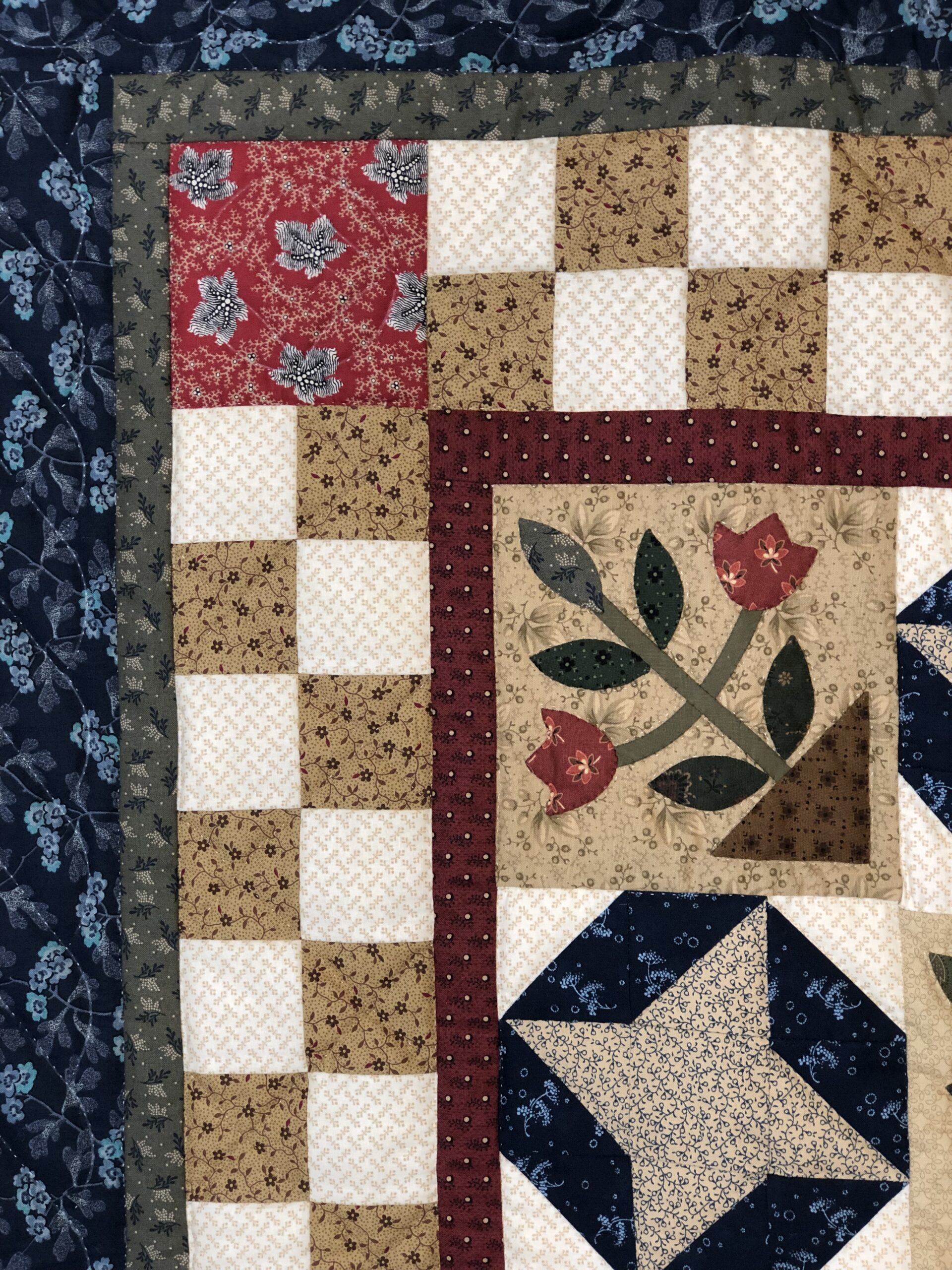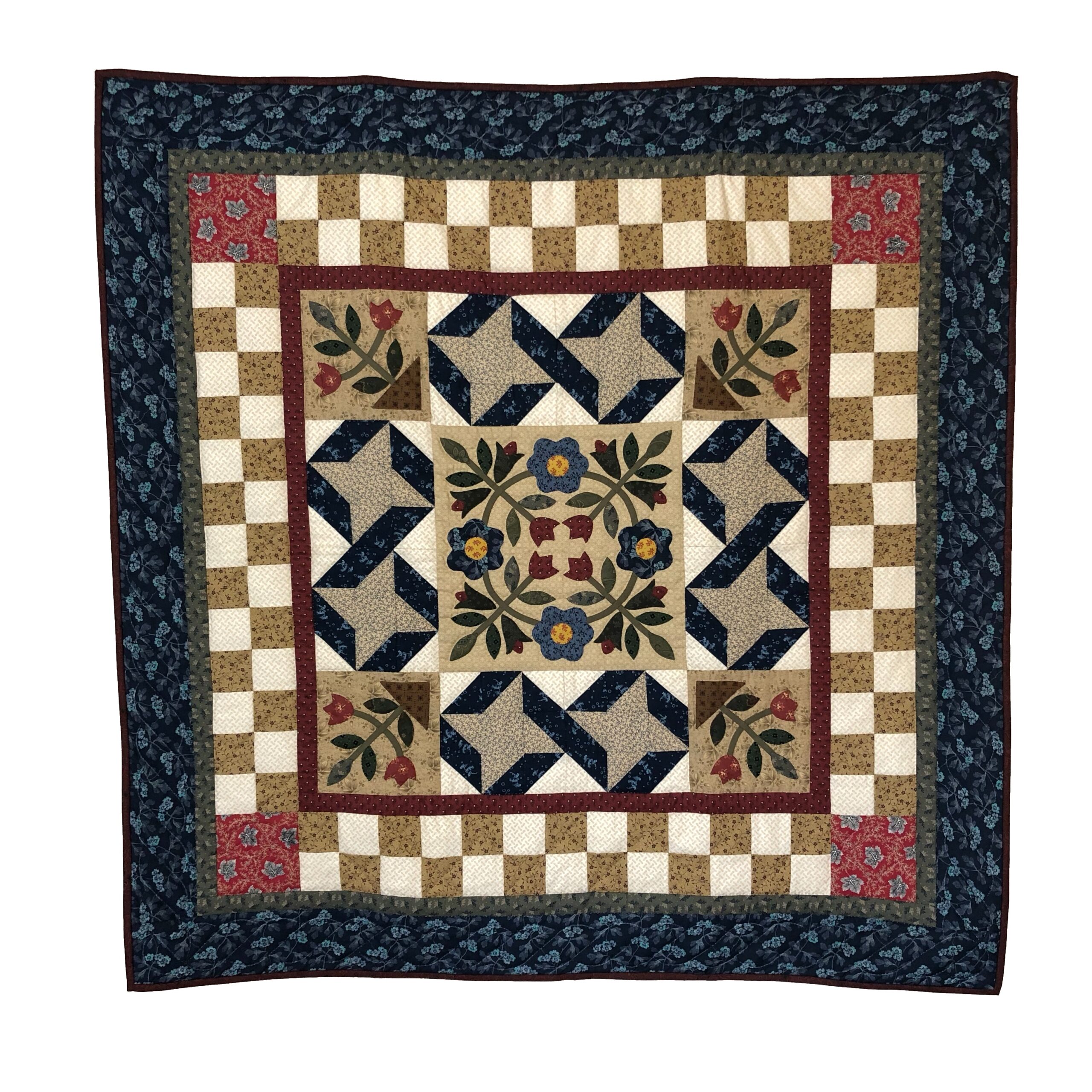 A graceful wreath is the focal point of this stunning small quilt. Tulips, buds, and flowers are combined in a pleasing arrangement with corner appliqué blocks radiating out from the center wreath along with ribbon star blocks that make a bold statement as they frame the central wreath. Next comes a checkerboard border that completes the look. Karel chose civil war reproduction fabrics because the tiny prints lend themselves well to small applique pieces. The hand quilting is expertly done.