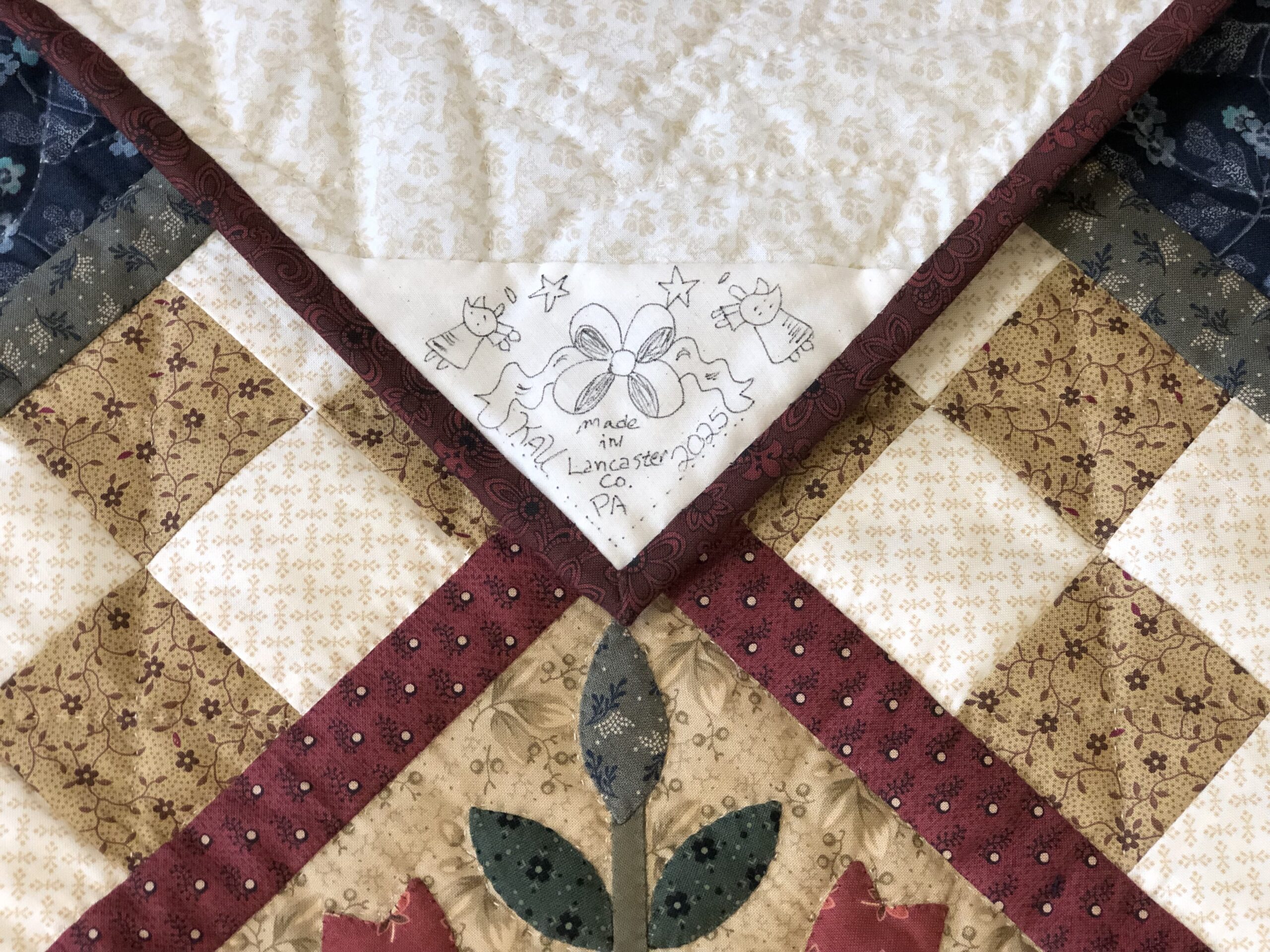 A hanging sleeve along with Karel’s signature patch are included on the back of the quilt.