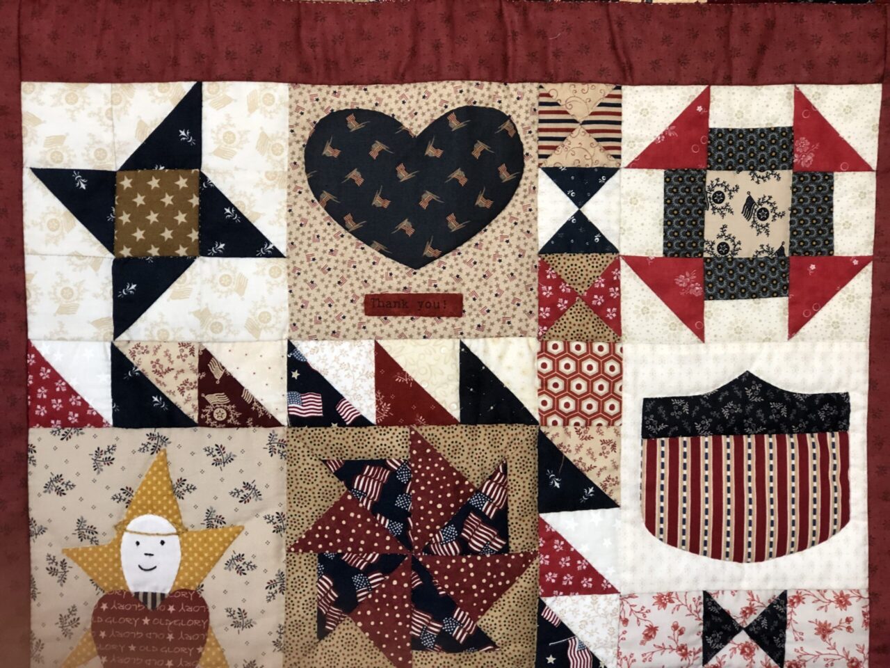 Patchwork Americana is a great addition to any patriotic decor.  Six patchwork blocks are arranged with the 4 appliqué blocks to create this pleasing original design.  Half square triangles, hour glass and checkerboards add interest as well.  Stars and Stripes are repeated both in appliqué and fabrics throughout this quilt.  Don”t miss the Heart block with the words “thank You” underneath that would make this the perfect gift for someone who has served our country.  A fun pieced inner border is finished off with a navy print in the outer border.  The workmanship is excellent from the quilting to the appliqué.