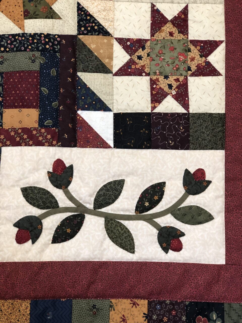 • The classic Whig Rose appliqué block has been used along with the 8-pointed star block in this design.  The clever placement of light and dark fabrics have created a unique, secondary border design that flows around the blocks .  A lovely floral design is hand-quilted in the other 4 blocks for contrast.  New England red, hunter green, mustard and navy with a touch of black make up this classic color scheme and look wonderful next to the tan and ivory background squares.  The hand quilting is tiny and precise and the appliqué is also beautifully done. A hanging sleeve and Karel's signature patch are included on the back.