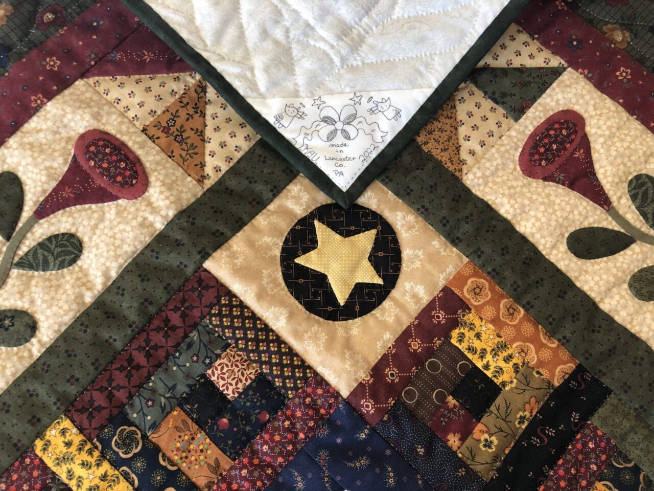 Here is one of Karel’s classic original designs, the Trumpet Flower, and it has always been a customer favorite.  Winding trumpet flowers, vines and leaves are surrounded by 5″ log cabin blocks and primitive stars in each of the 4 corners.  Multi colored fabrics have been used in warm country colors that give it a charming “scrappy ” look as well.  Karel is known for incorporating many different fabric prints in her designs along with hand quilting and appliqué which are all expertly done.