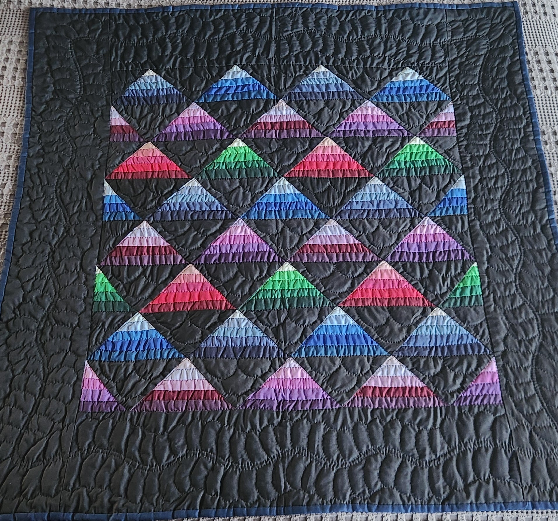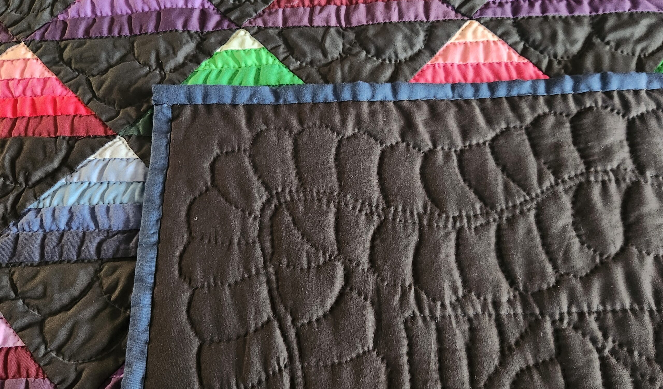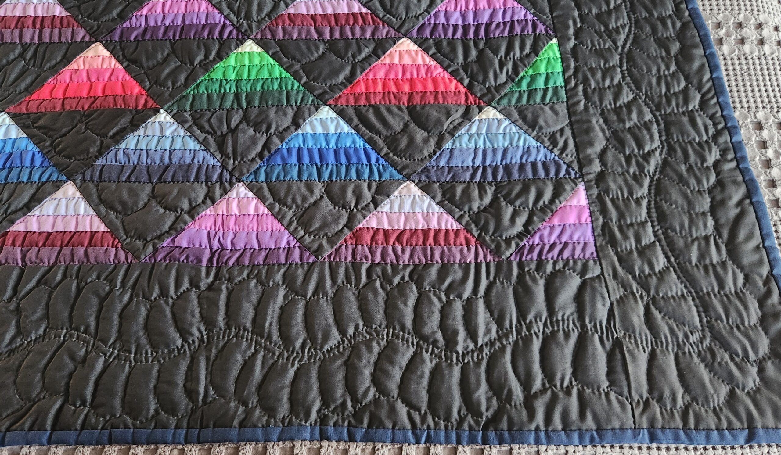 A truly impressive work of art by an Amish woman in Indiana. This difficult pattern is very well made. Entirely hand quilted with nice, even stitches. Great color selections! There is no hanging sleeve on this quilt so you can choose to hang it in any direction. This quilt would look amazing in a place of business, or a home. A great gift idea for an employer or friend. (The Indiana Amish lady who made this quilt is not the same lady who makes our official “Indiana Amish” quilts.)