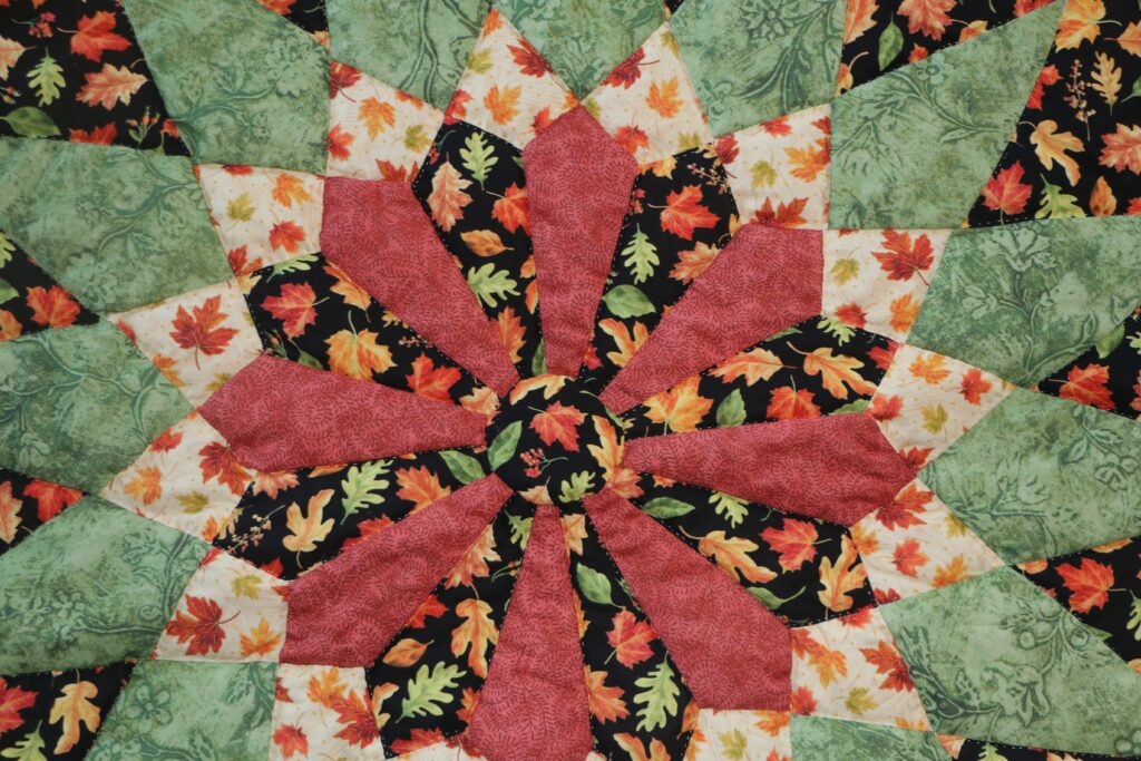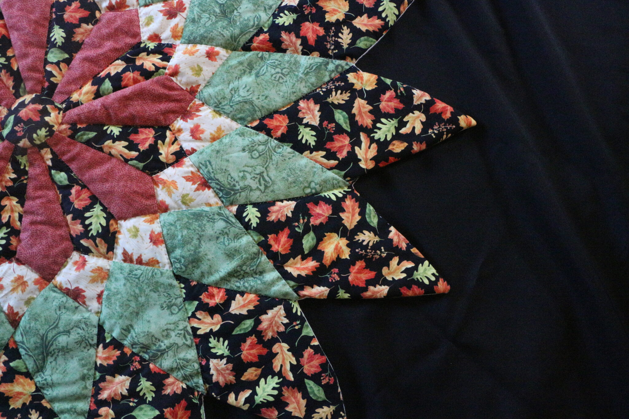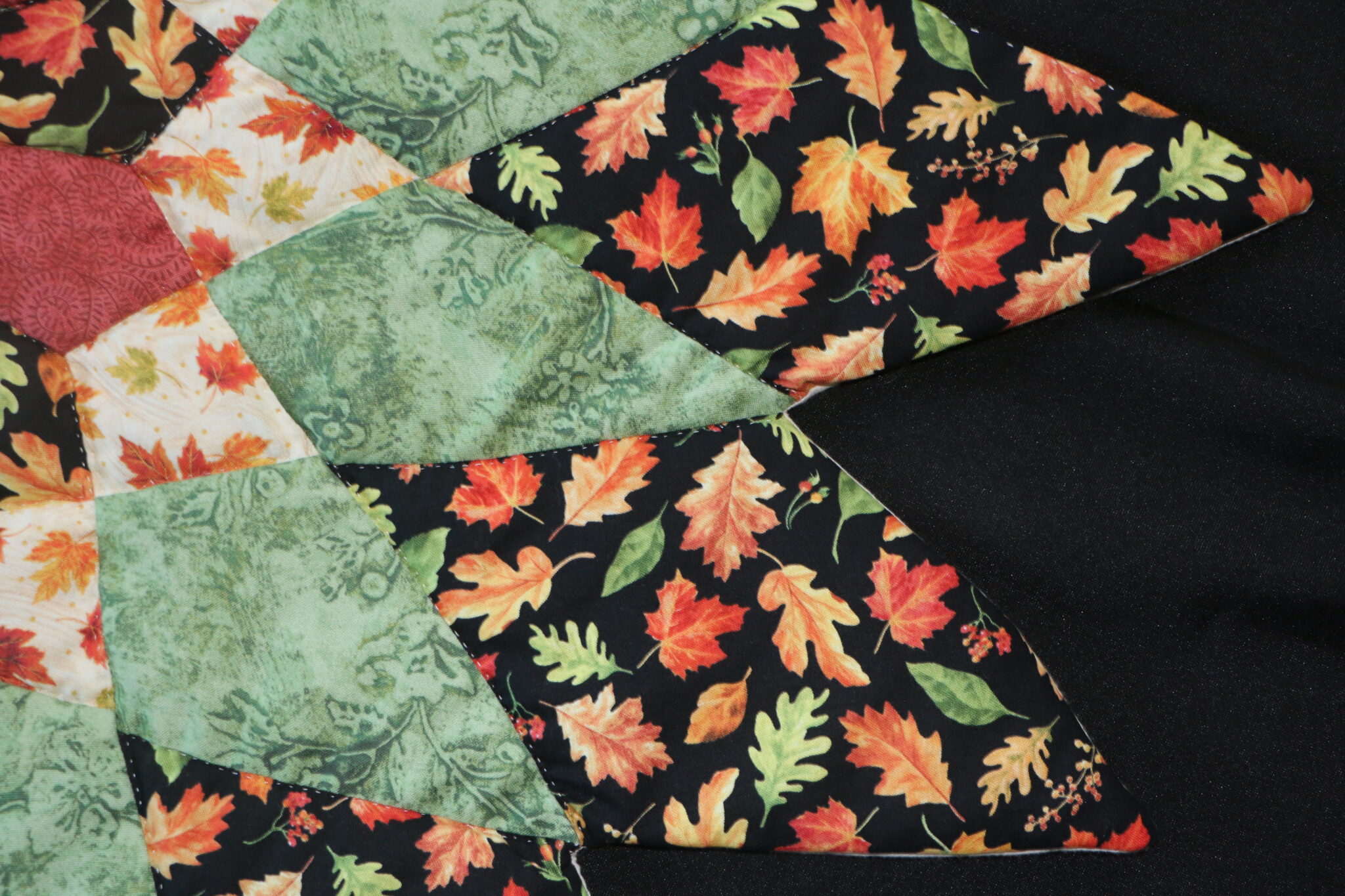 Lovely table top in nice fall colors. Fabrics blend together for a beautiful table top. Pieced and quilted by Barbara Lapp