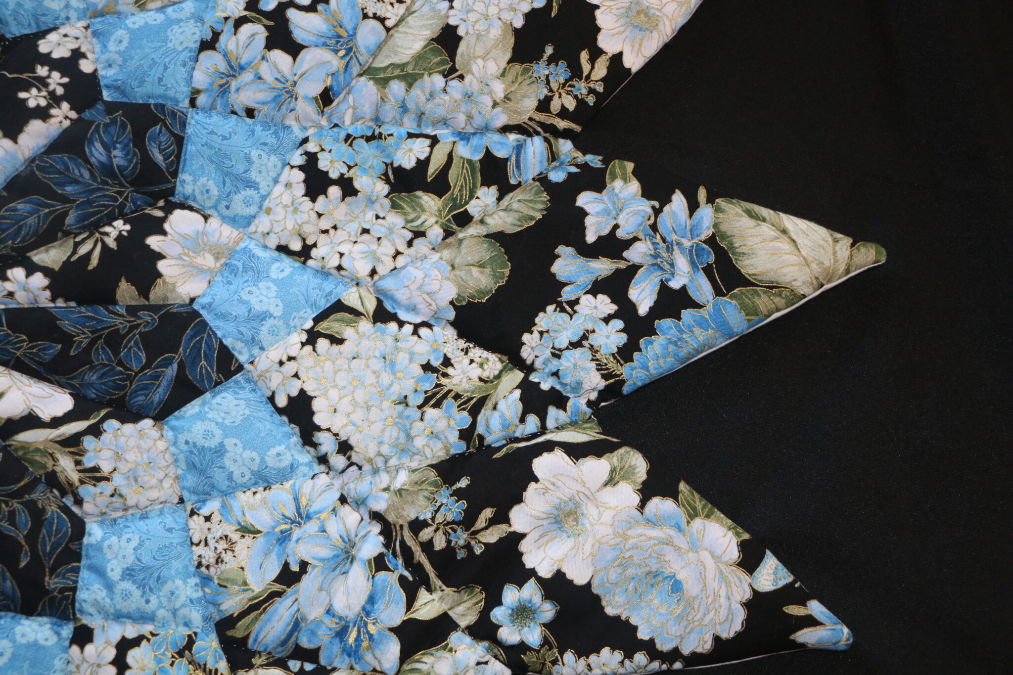 Made by a Mennonite Lady in Lancaster Co.A beautiful Table Top in a lovely Star design. This is a perfectly round center piece. Each piece of fabric has to perfectly match to get the perfect design. Stunning!! All in black and white fabrics. Made by a Mennonite Lady in Lancaster Co. -