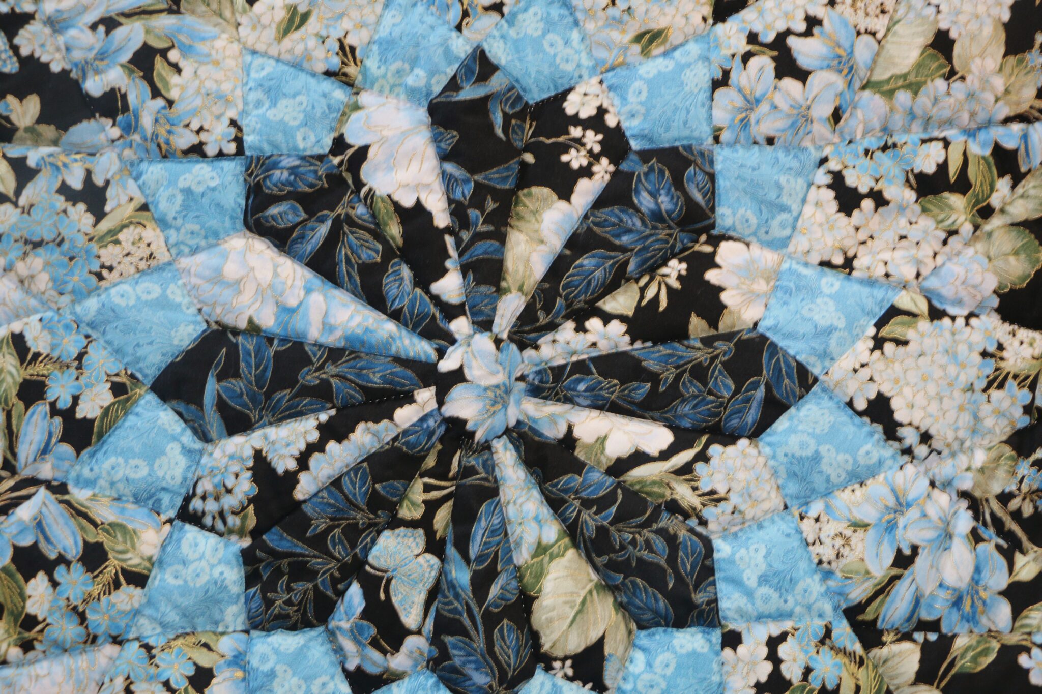 A Quilt by Ruth Flaud27 inches wide by 27 inches longrfq10095A beautiful Table Top in a lovely Star design. This is a perfectly round center piece. Each piece of fabric has to perfectly match to get the perfect design. Stunning!! All in black and white fabrics.