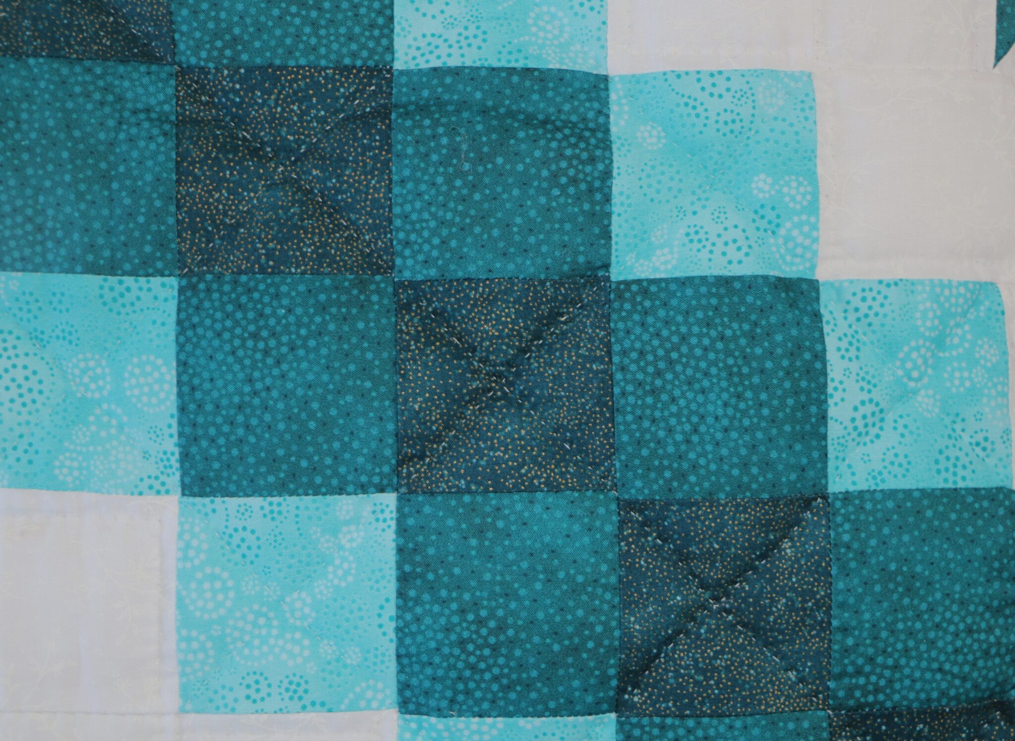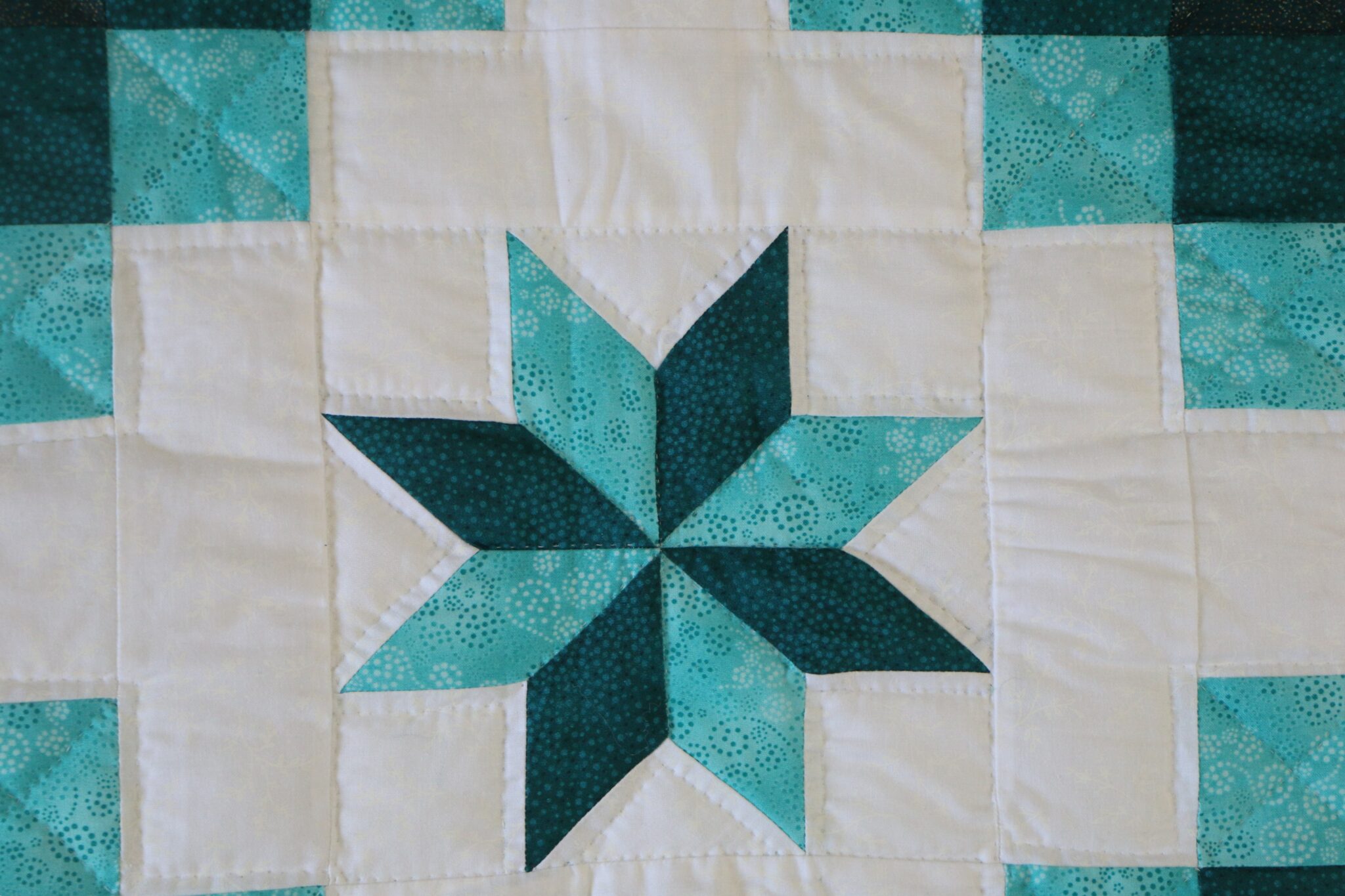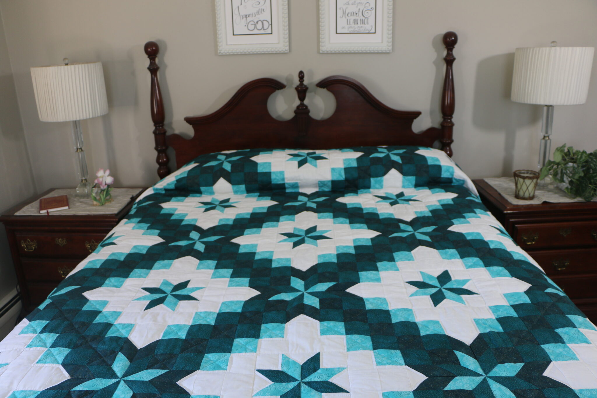 This quilt will brighten any bedroom, so pretty. Beautiful Stars encased in Triple Irish Chain block design. The Aqua-Teal fabrics makes this a beautiful quilt. Has a beautiful print backing. Quilted and pieced by Amish woman in their homes.