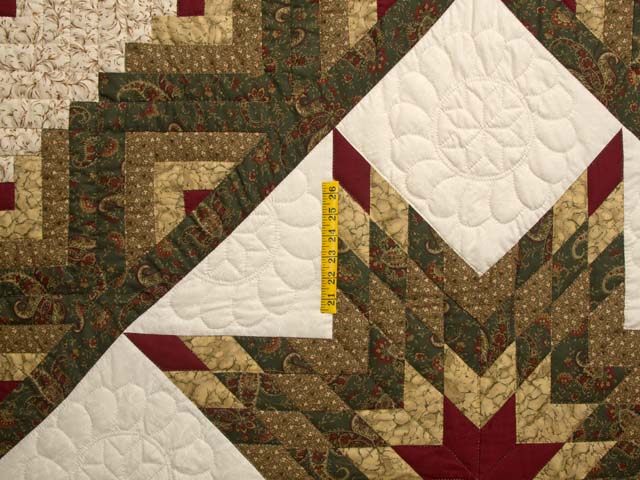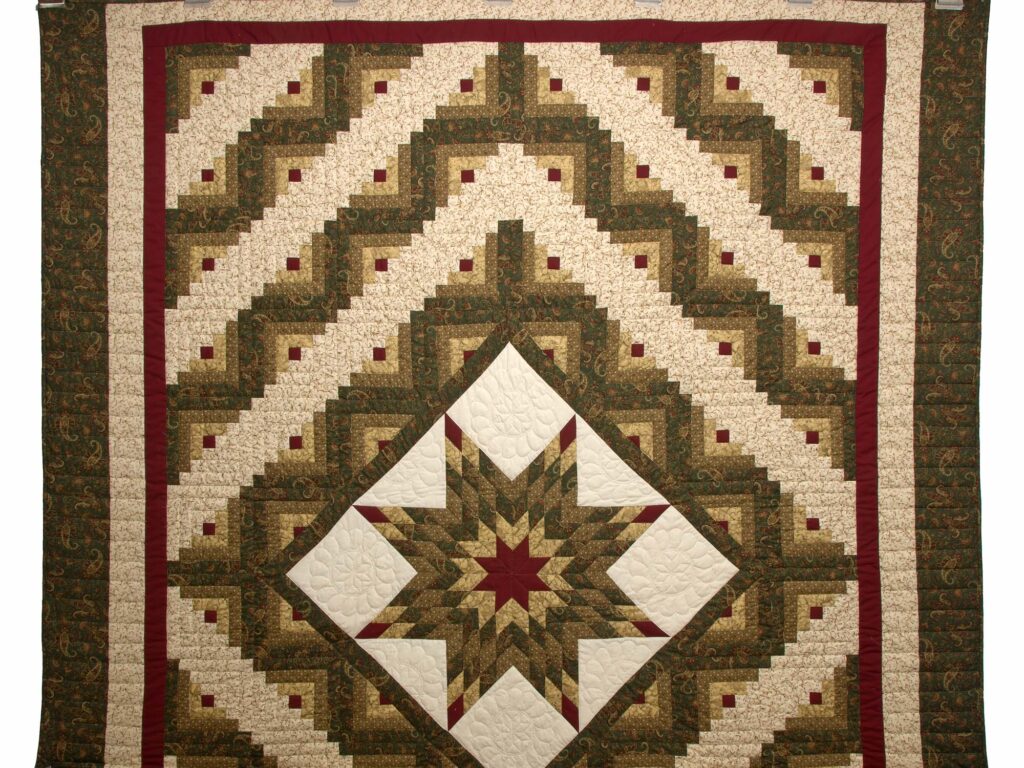 A wonderful sharp Lone Star in subdued earth tones. Very attractive fabric selections. Note the careful piecing and nice quilting. Made in Lancaster by a Mennonite woman.