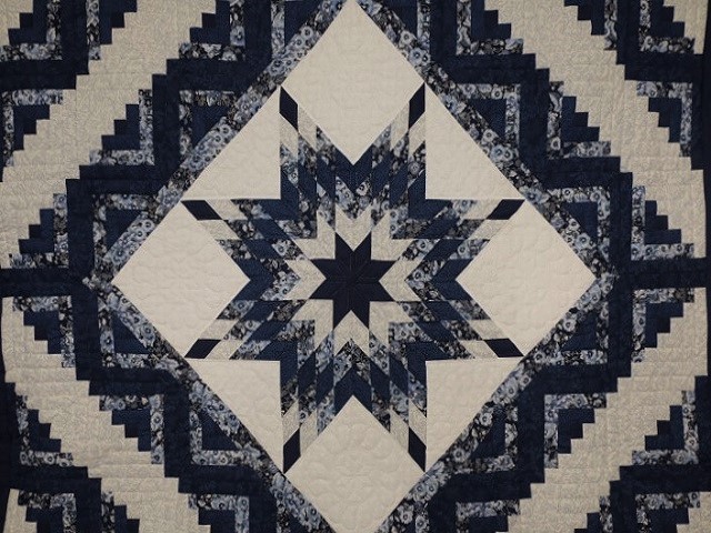 A bold, striking, sharp and elegant quilt . Very attractive Navy fabrics, also included a fabric featuring a popular pansy print. Note the careful piecing and extra fine quilting. Quilted by a Amish woman in her home. Fabrics chosen by a Mennonite woman.