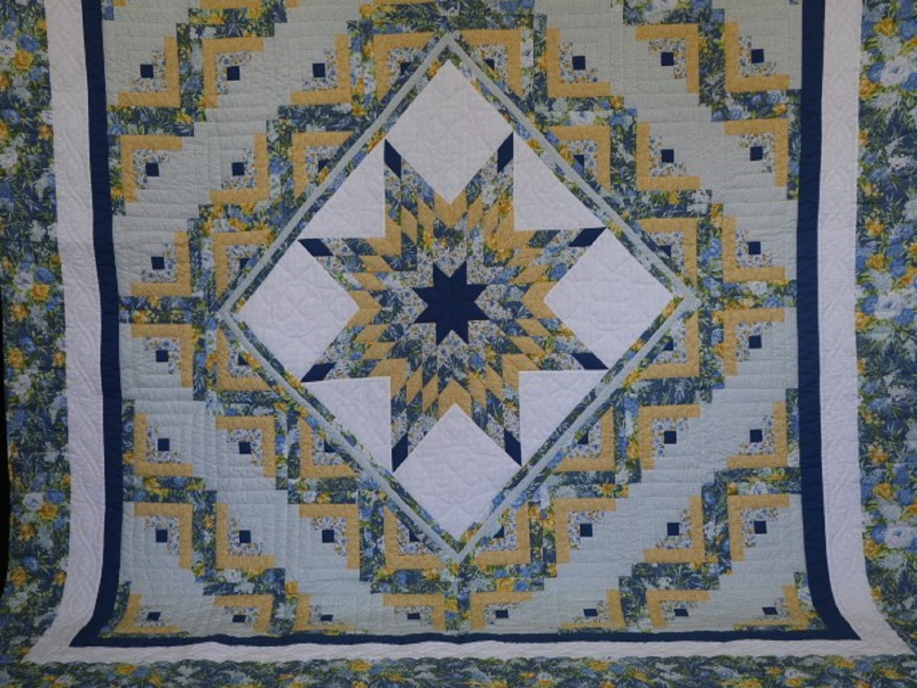 What a lovely blue with a golden yellow color combination. A beautiful quilt in the Lone Star and Log Cabin design! Note the careful piecing and nice fine quilting stitches. Made in Lancaster by a Mennonite woman. The quilting was done by a Amish woman in her home. A very beautiful quilt !