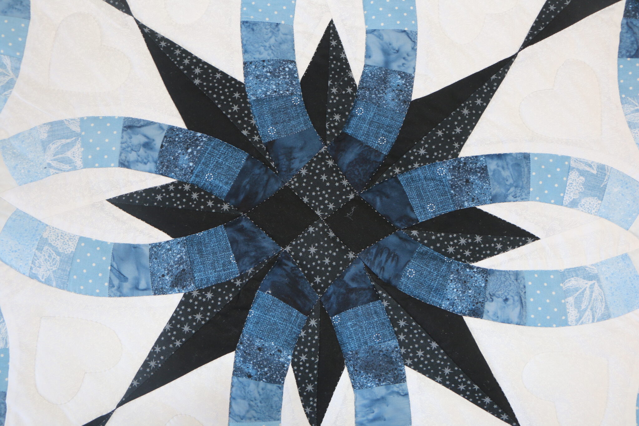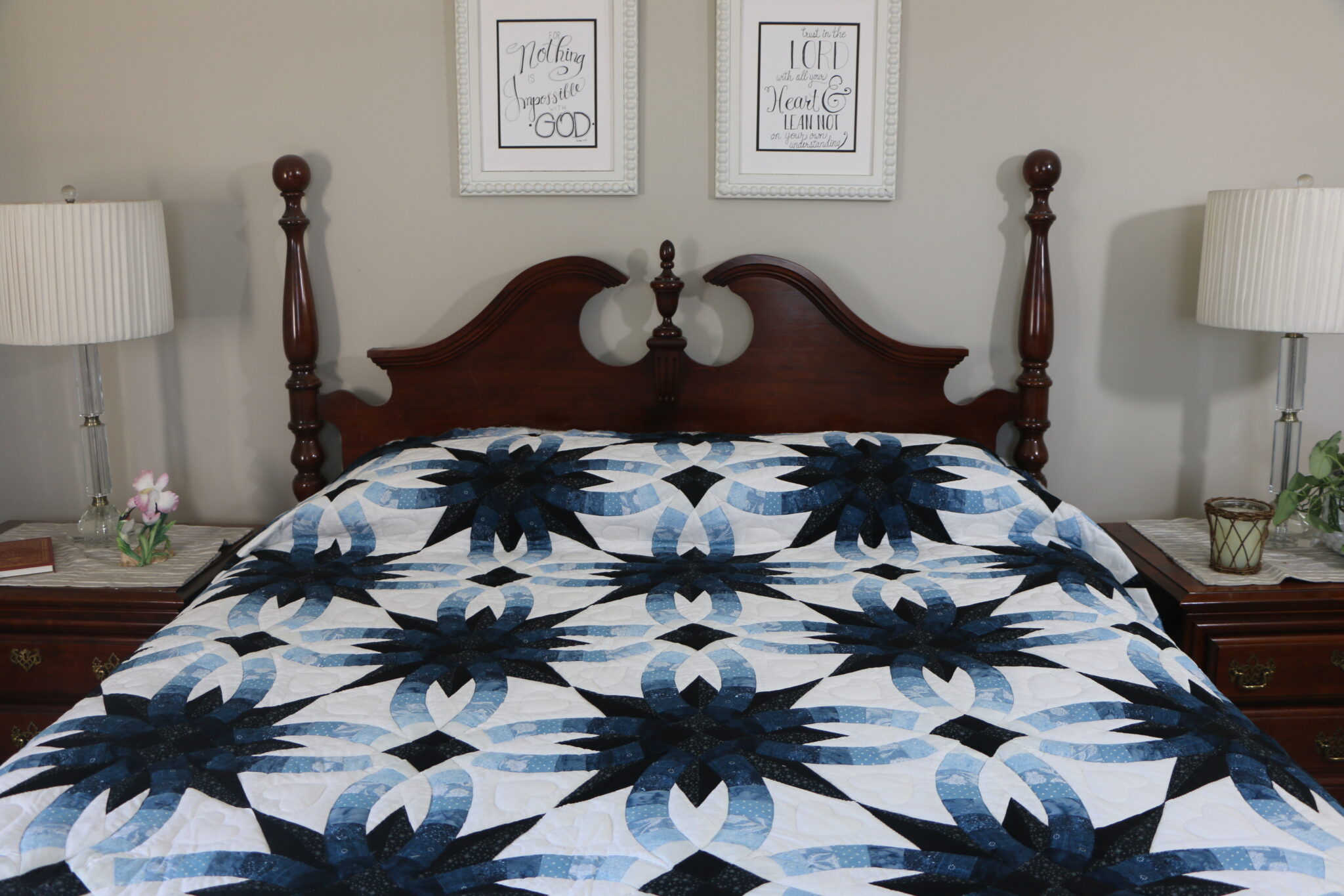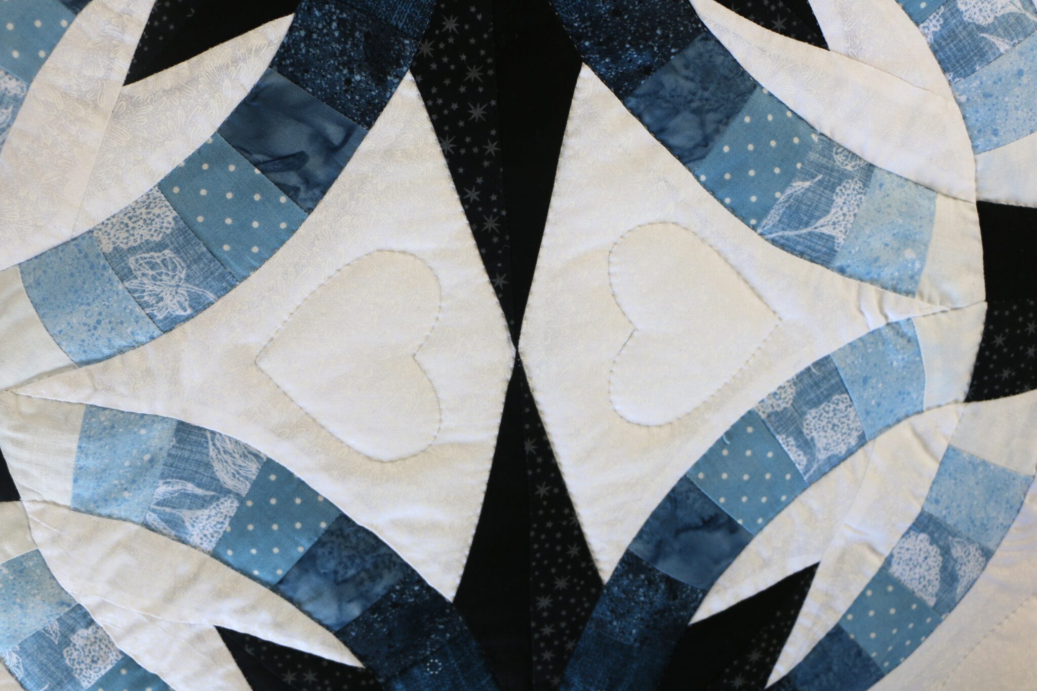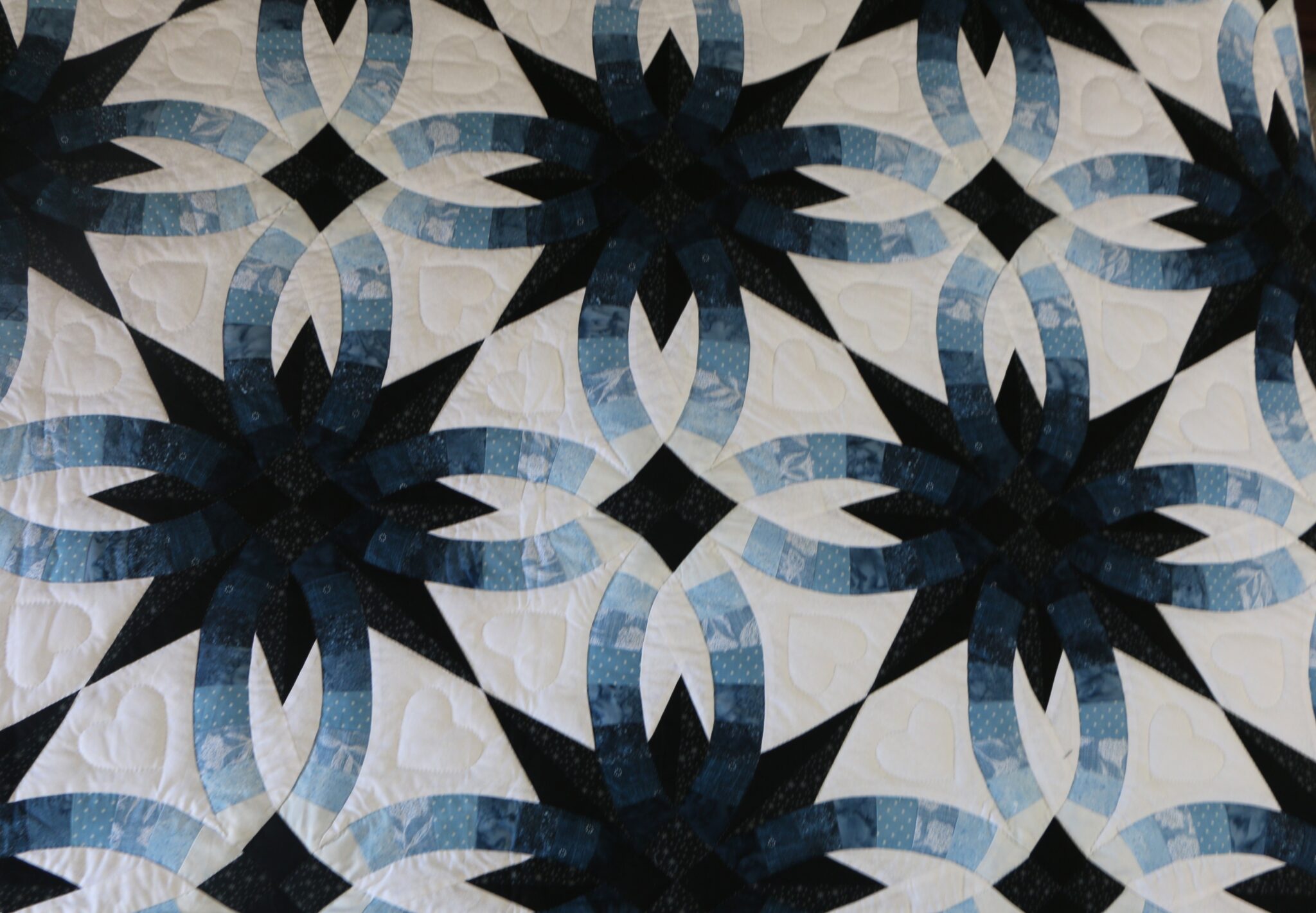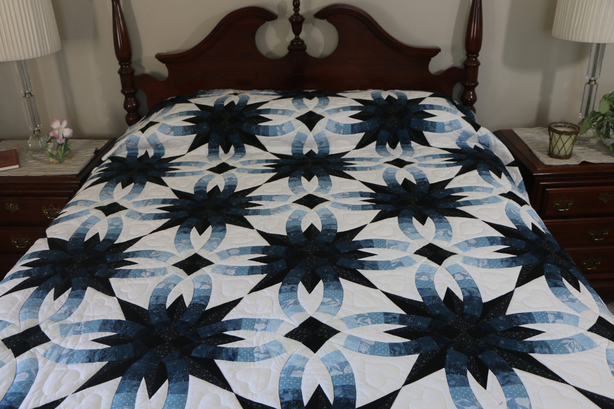 Stunning..Gorgeous.. A Double Wedding Ring quilt, the pattern has been changed to also feature a star within the ring. Truly a piece of art, a quilt taken to new level. The background tone on tone cream off white cotton print. Be sure to note the hearts within the ring. Was pieced by a Mennonite woman in her home and then quilted by a Plain woman.